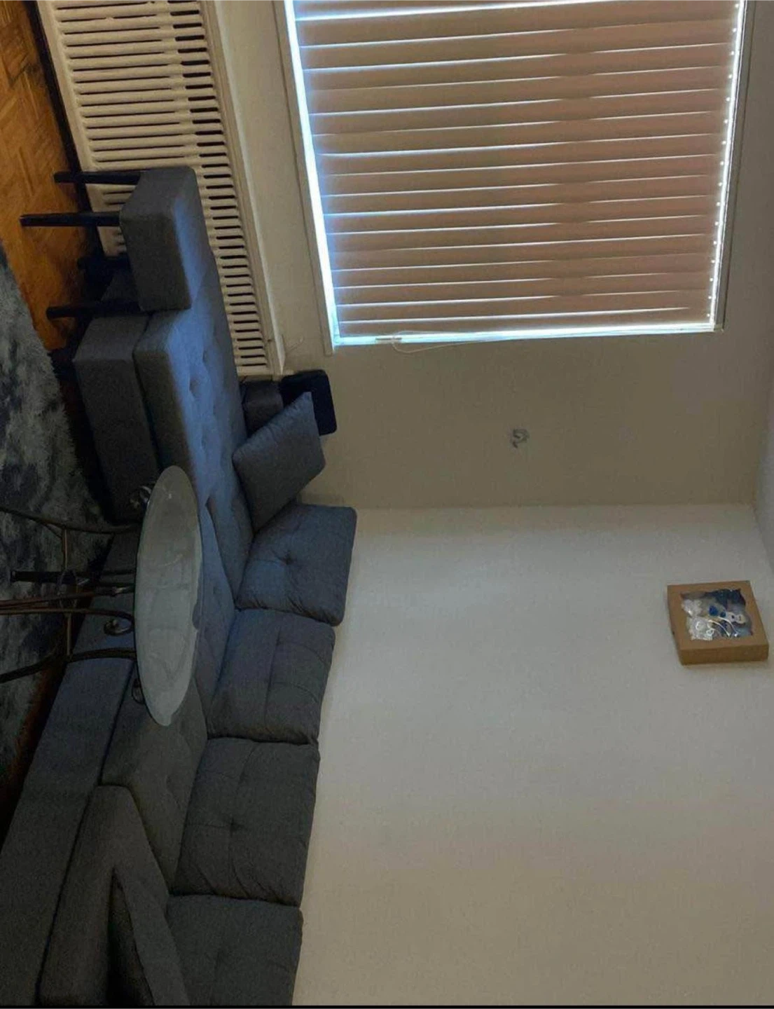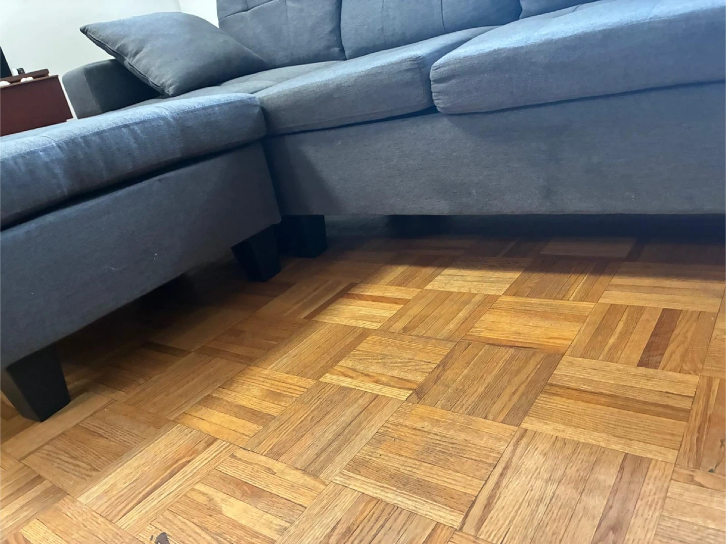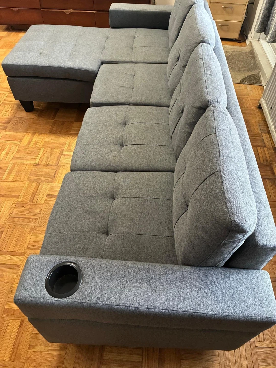 Selling a comfortable grey sectional sofa that includes an ottoman. It's in great condition and ready to add some cozy seating to your space. Perfect for lounging and relaxing after a long day!