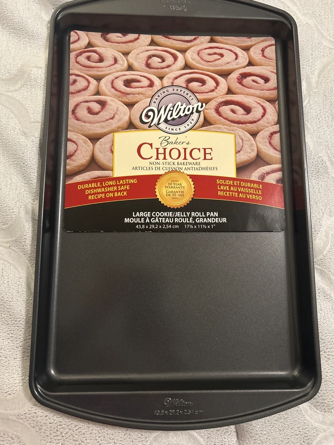 Selling a brand new Wilton Baker's Choice Large Cookie/Jelly Roll Pan! It's durable, long lasting and dishwasher safe. It also has a recipe on the back. The dimensions are 43.8 x 29.2 x 2.54 cm (17¼ x 11½ x 1")