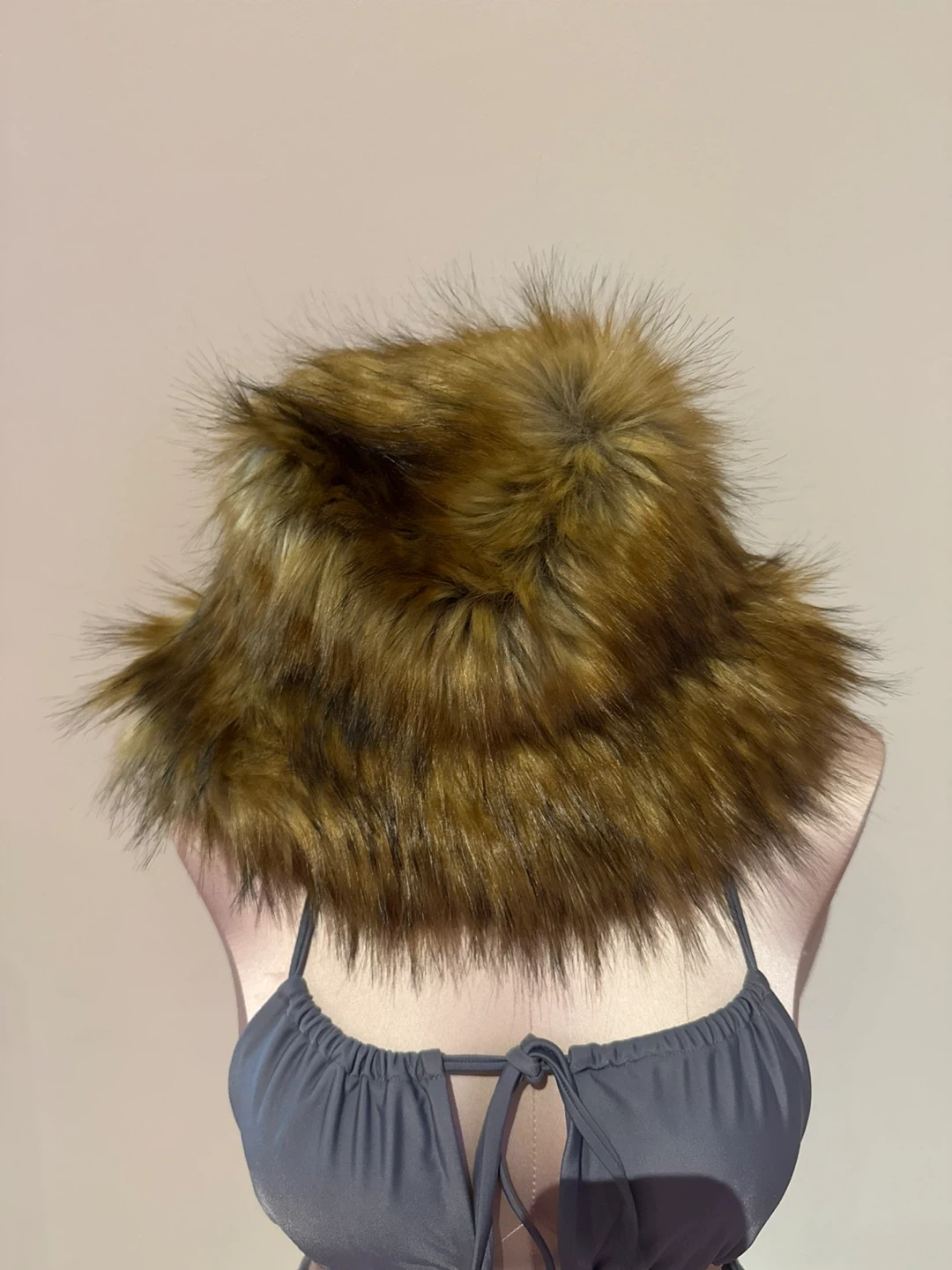 Selling a faux fur bucket hat. It's a stylish accessory to add to your wardrobe for some extra warmth and flair! The brown tones are really versatile and can be paired with a variety of outfits