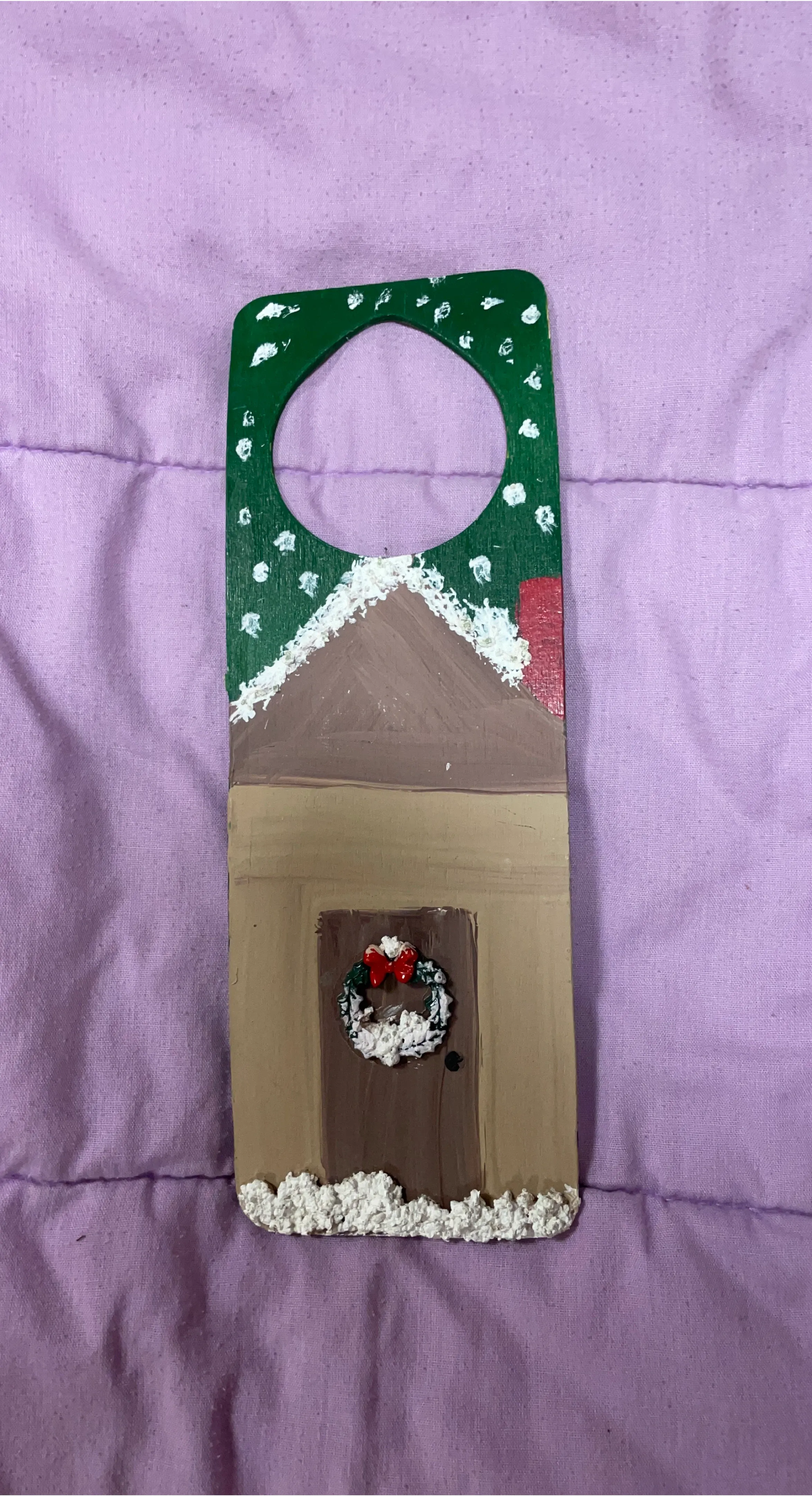 This is a cute, hand-painted holiday door hanger. It features a charming house design with festive details like a wreath and snow accents. Perfect for adding a touch of handmade charm to your holiday decor.