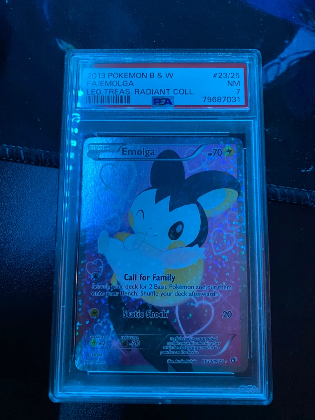 Selling a 2013 Pokemon Black & White Emolga card from the Legendary Treasures Radiant Collection! It's in NM (Near Mint) condition and graded a 7. A great addition to any Pokemon card collection