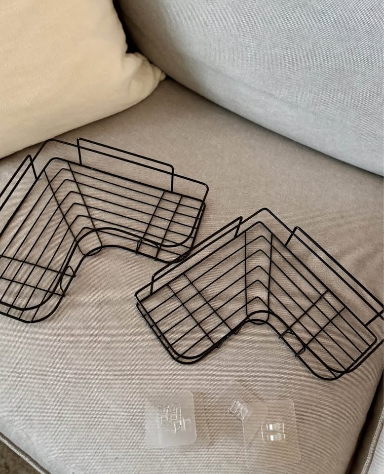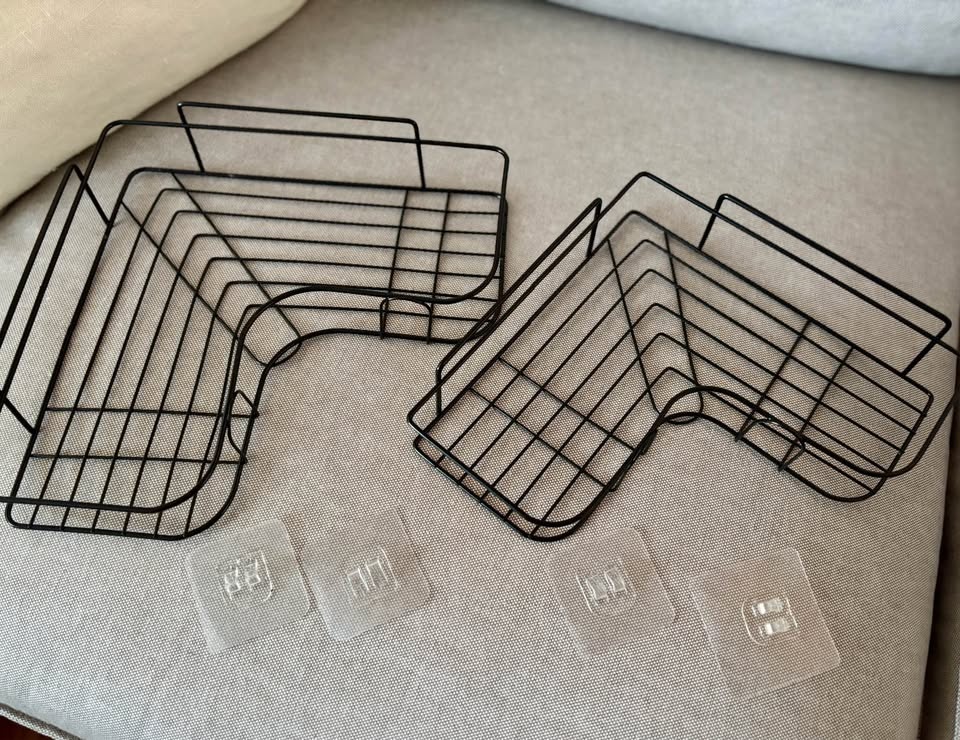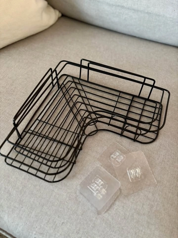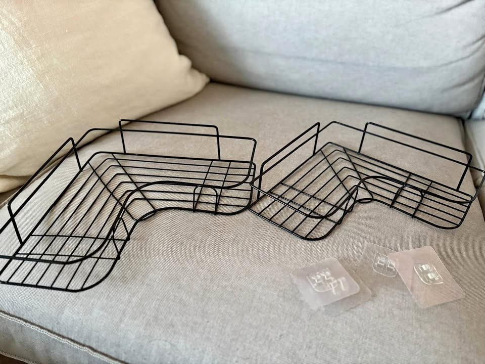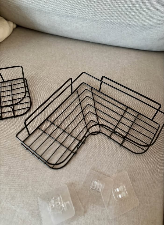 Two new corner shower shelves / shower caddies. There are four adhesive stickers to hold them in place - I ordered a large set of 6 and don’t need these.
