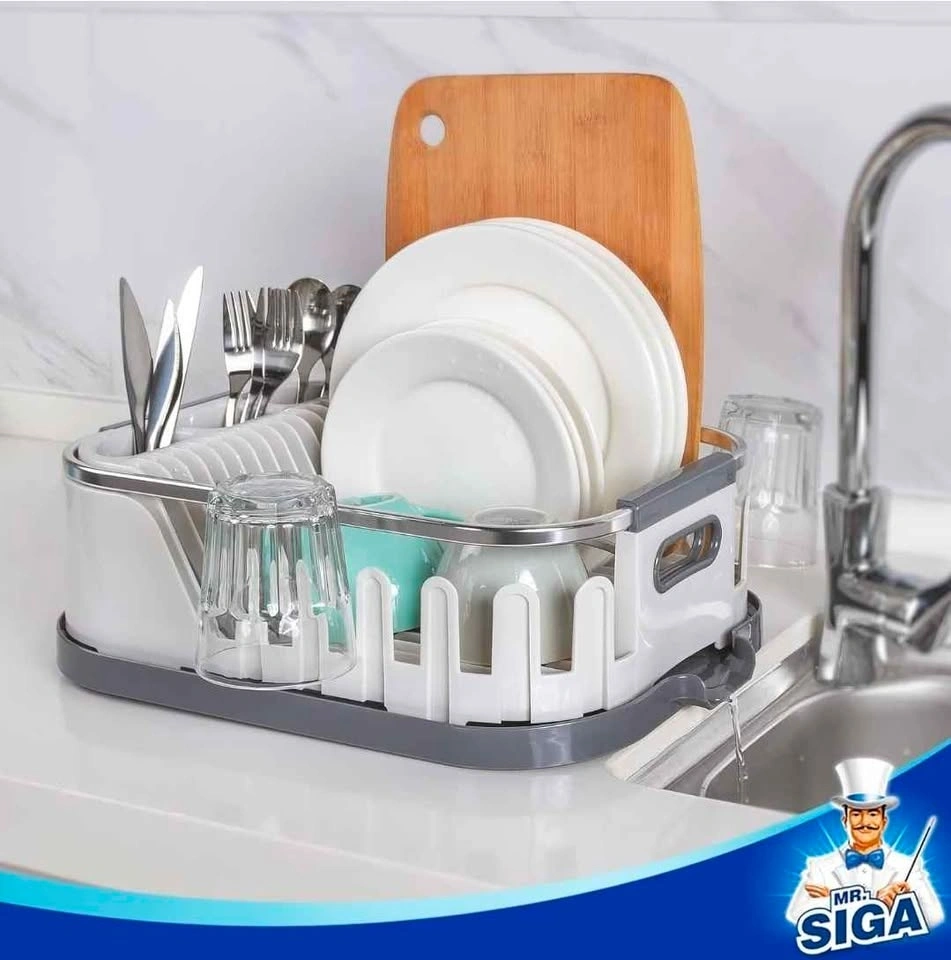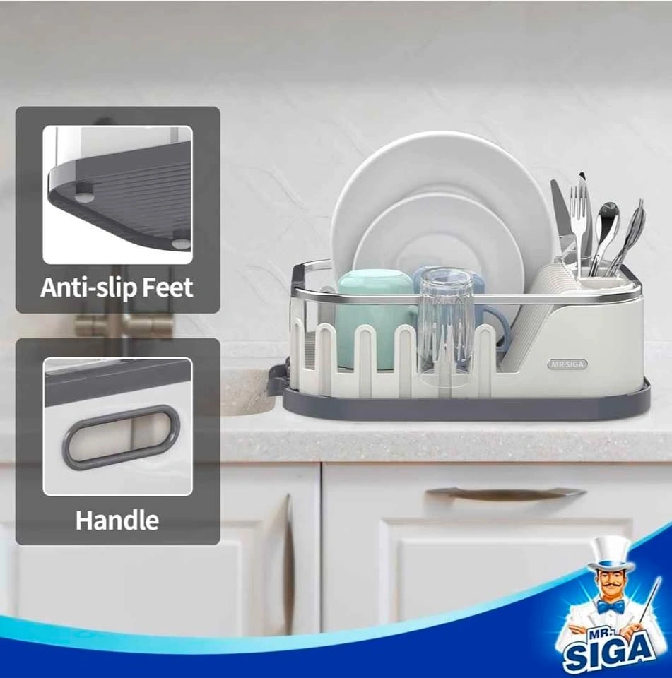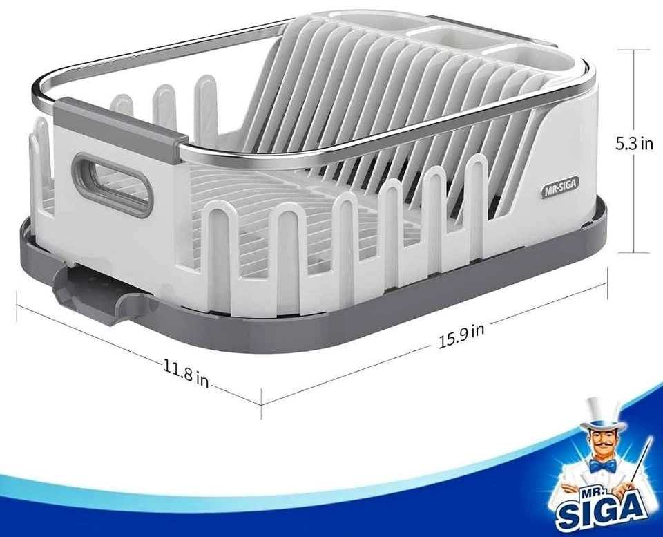 MR.SIGA Dish Drying Rack for Kitchen Counter, Compact Dish Drainer with Drainboard, Utensil Holder and Cup Rack, White