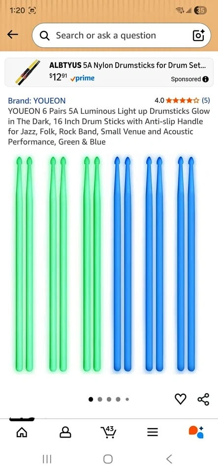 6 pairs 5A Luminous performance, Green and Blue Drum sticks