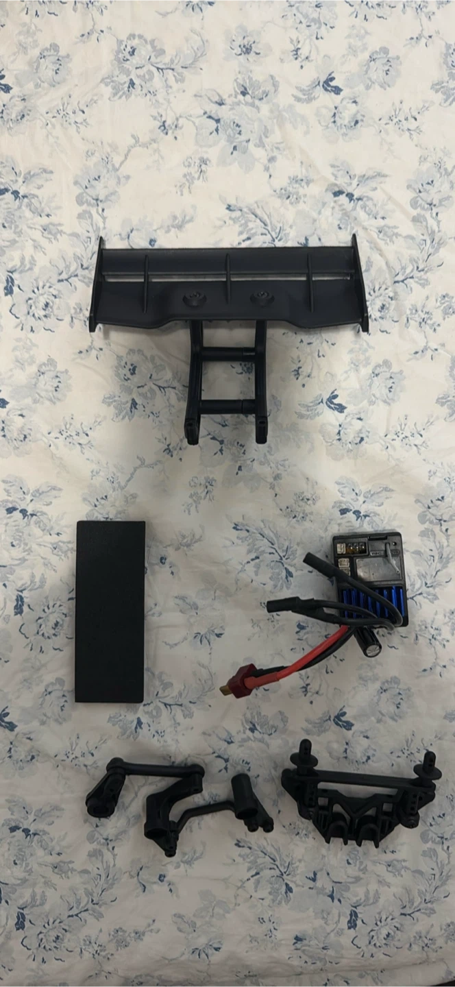 It comes with a remote control, two batteries, and some additional parts, including a spoiler