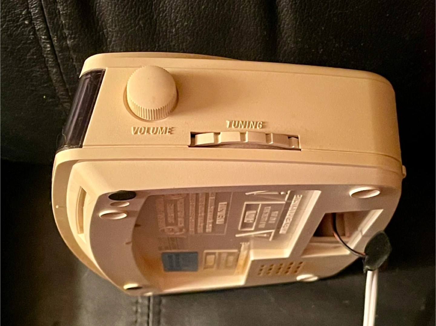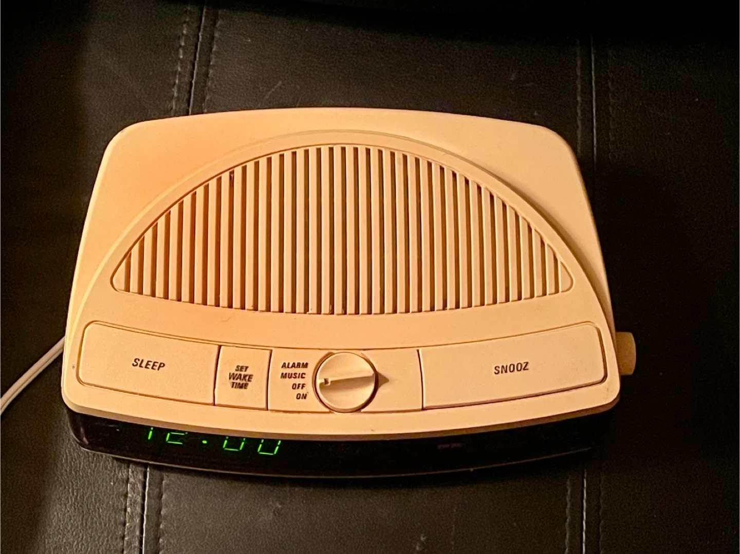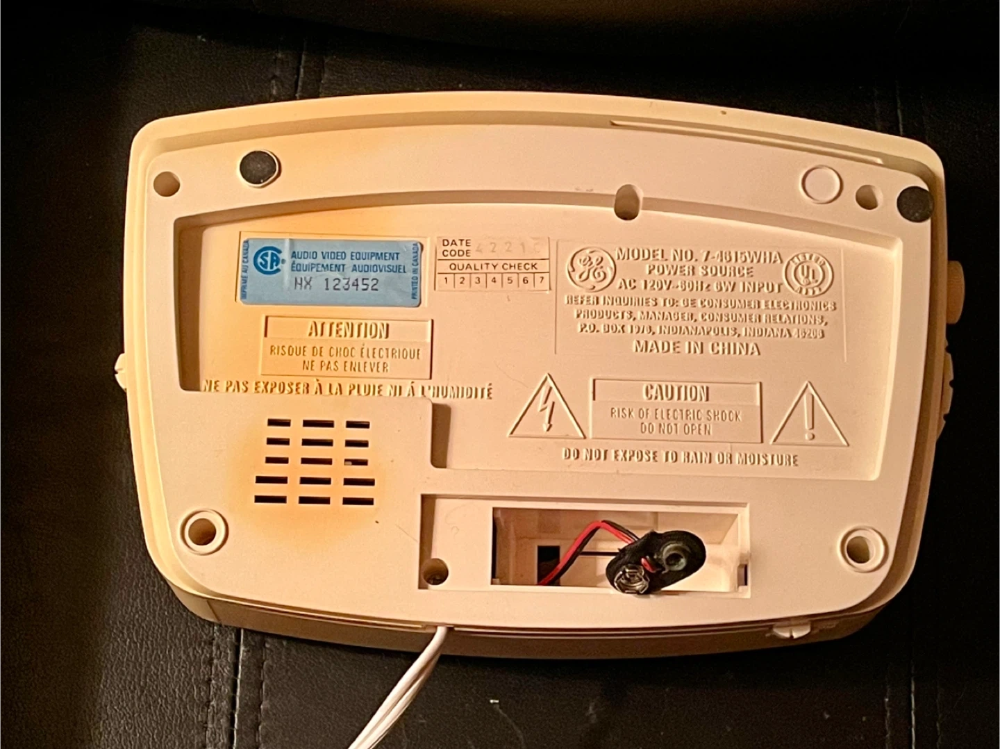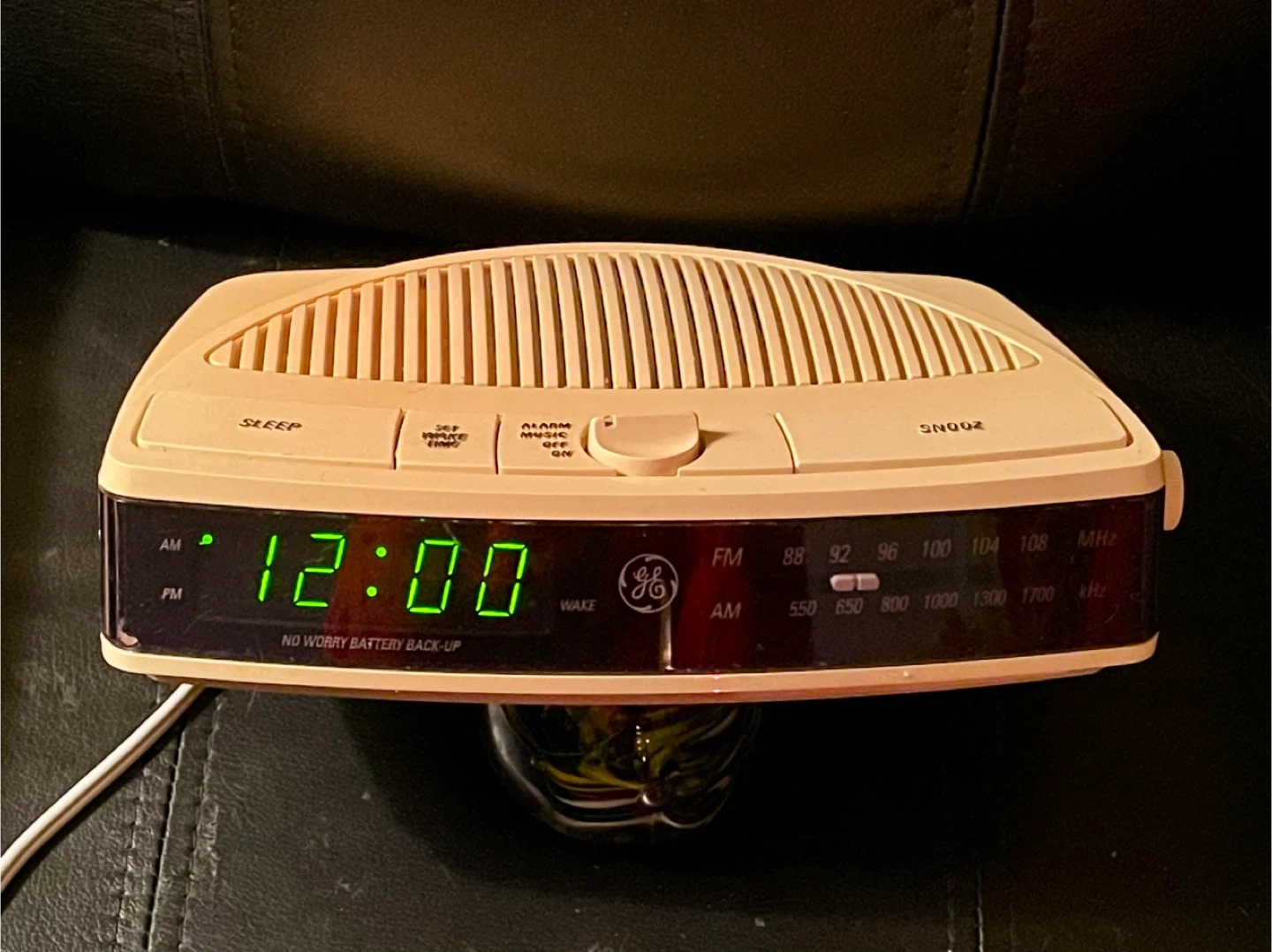 Selling a vintage GE AM/FM digital alarm clock radio. It has a classic design with a digital display. The model number is 7-4615WHA. It features sleep, wake time, and snooze functions. It also has a tuning knob for the radio. Works perfectly but there is some discolouration to the plastic. Requires 9 V battery for backup.