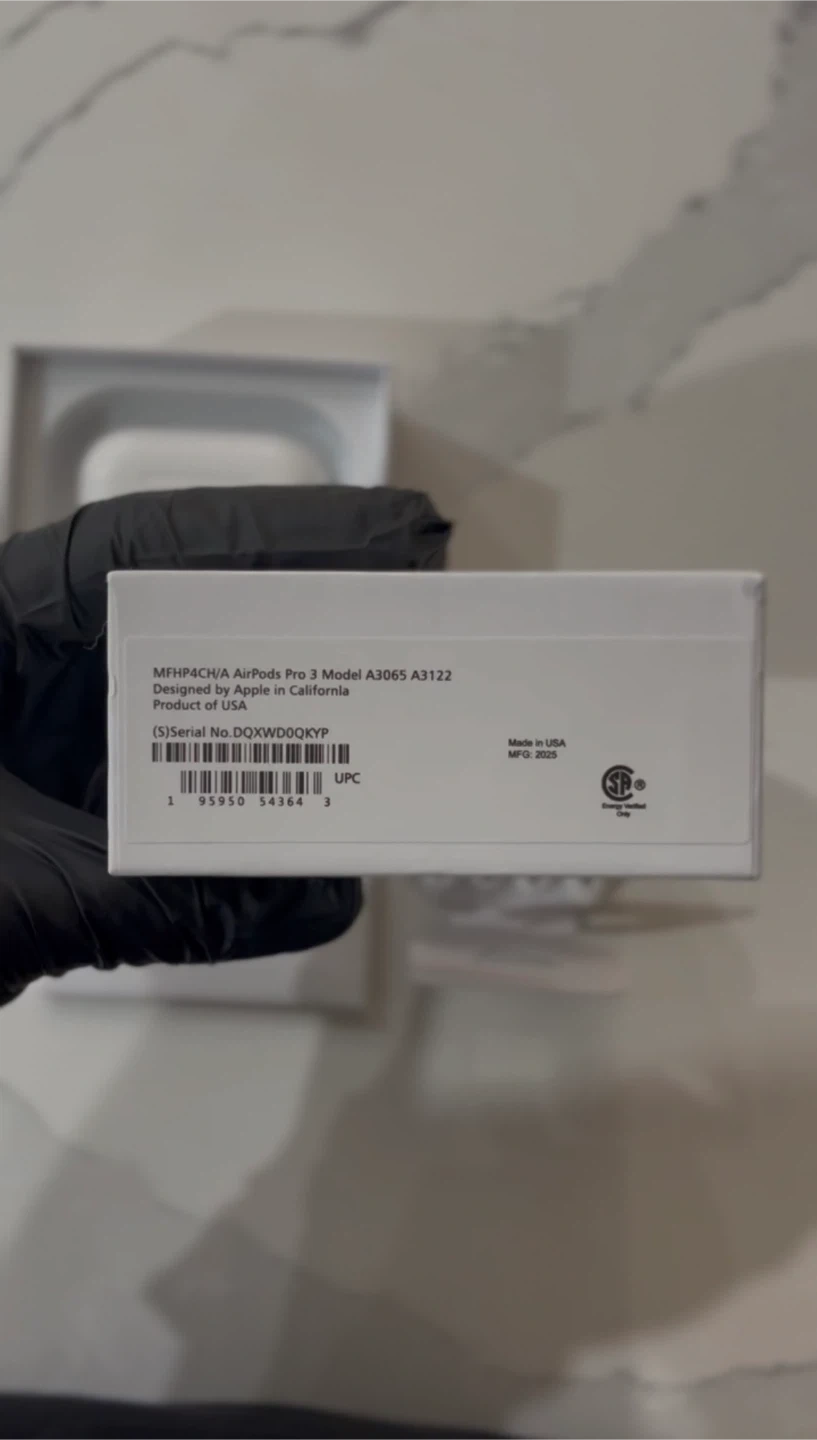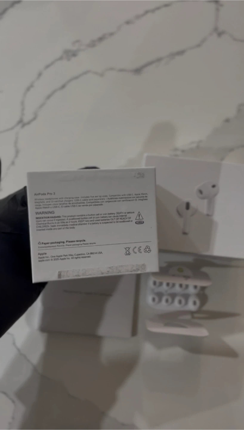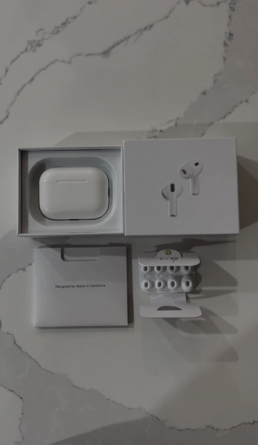 Selling a pair of Apple AirPods Pro 3 in excellent condition! They come with the box and all original components. The box indicates a manufacturing date of 2025. These earbuds are compatible with USB-C cables and are designed by Apple in California