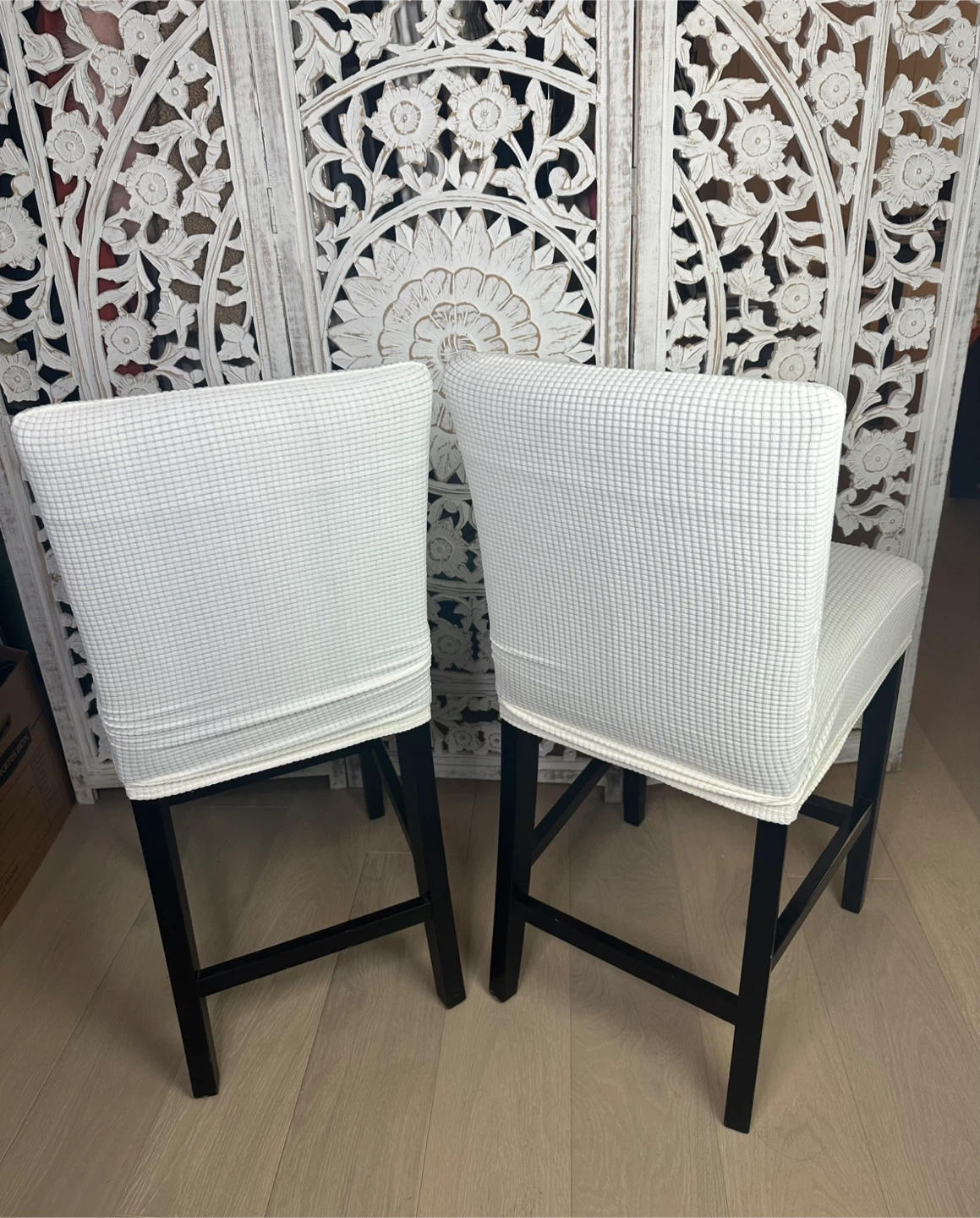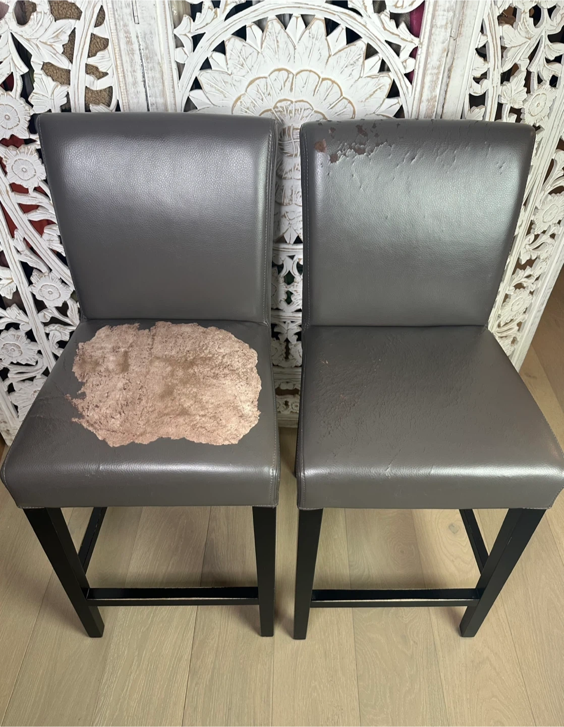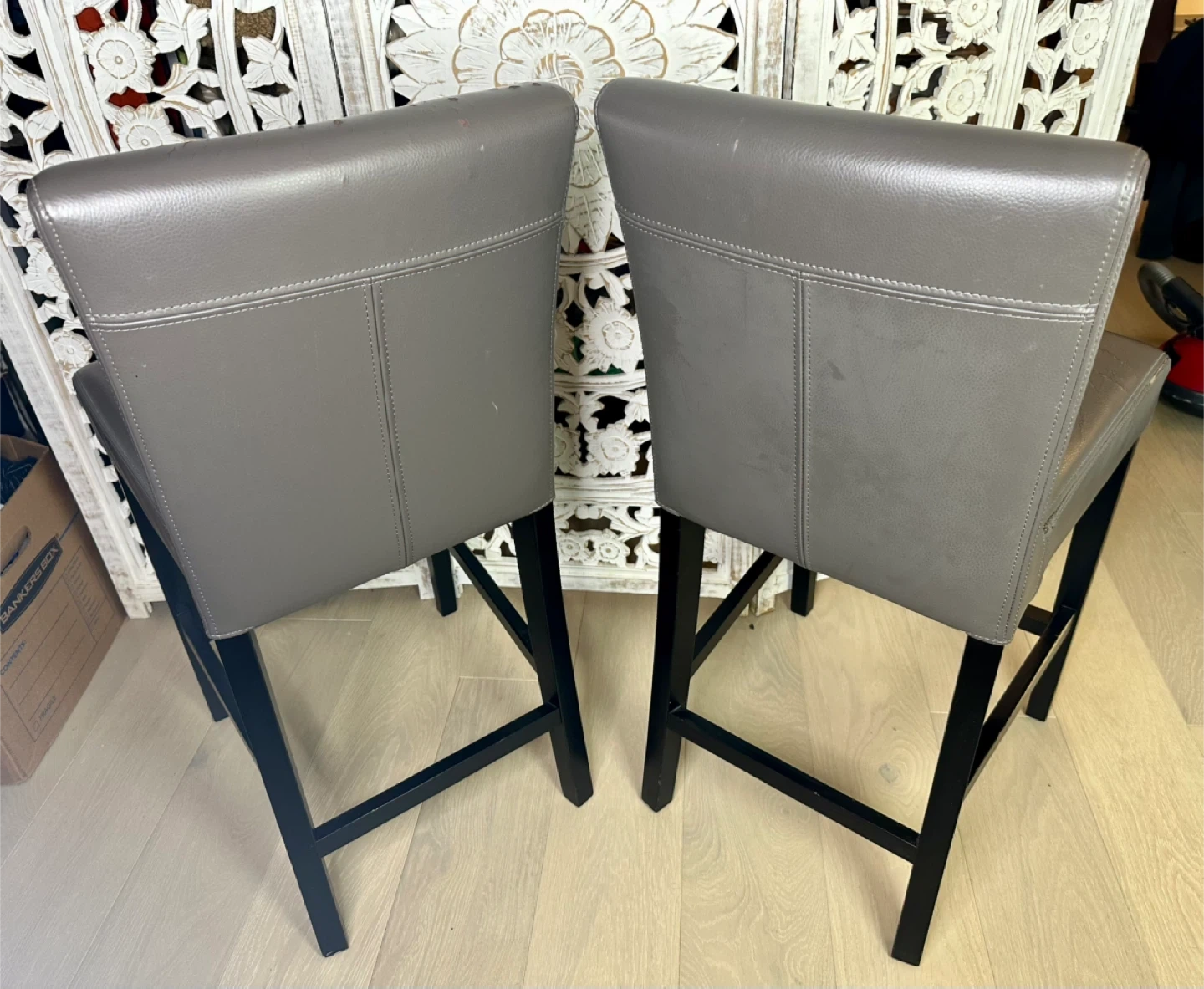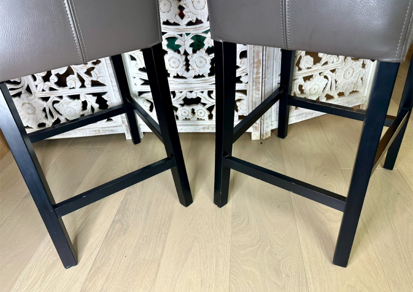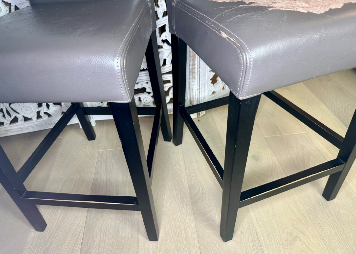 These are the most comfortable counter stools I’ve ever used! They feature a Smoke Grey leather finish, though the surface has cracked and peeled in places. I’ve been using them with Ivory slipcovers, which completely hide the issue. The slipcovers are stretchable, washable, and additional colors are available online if you want to change the look.