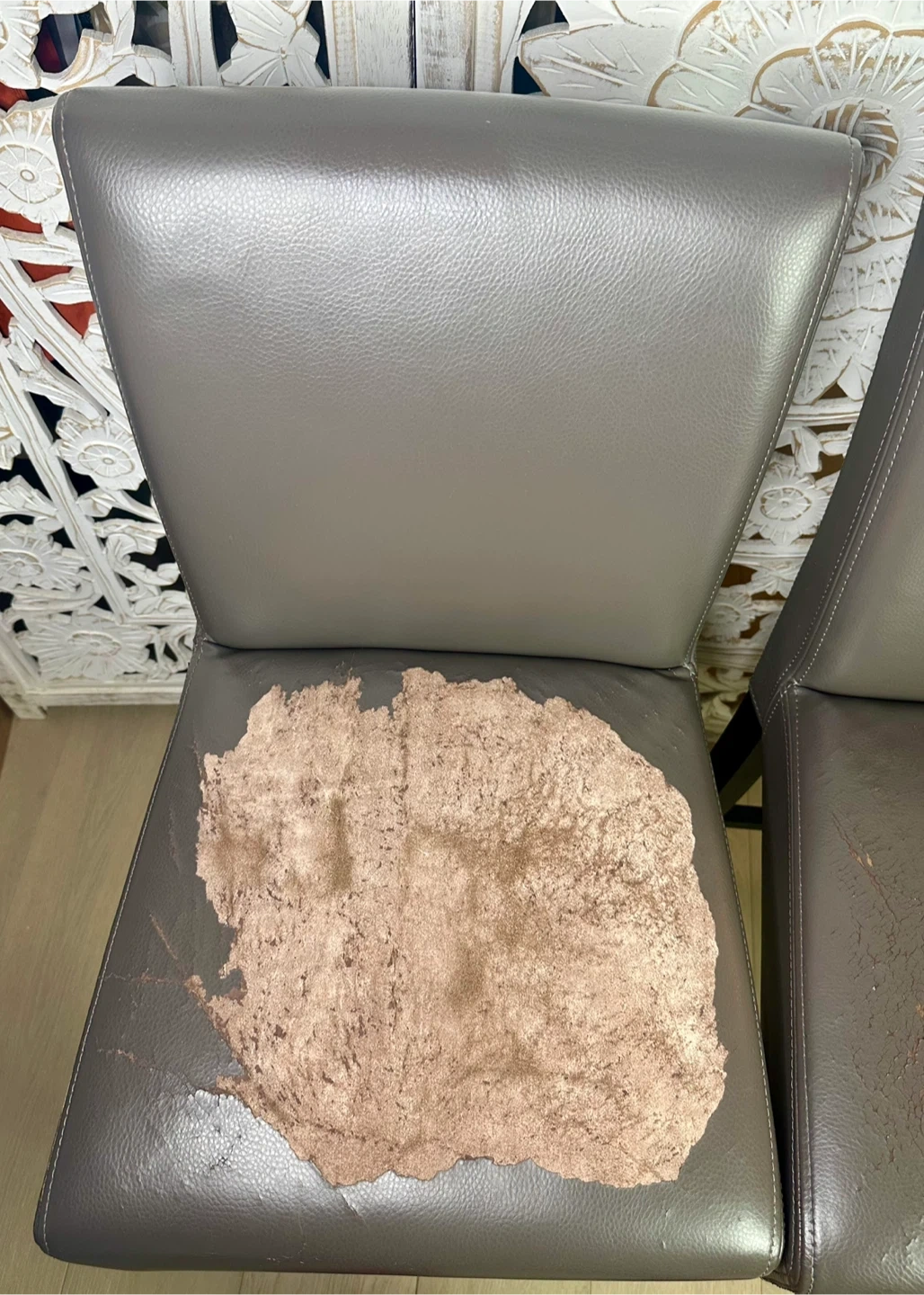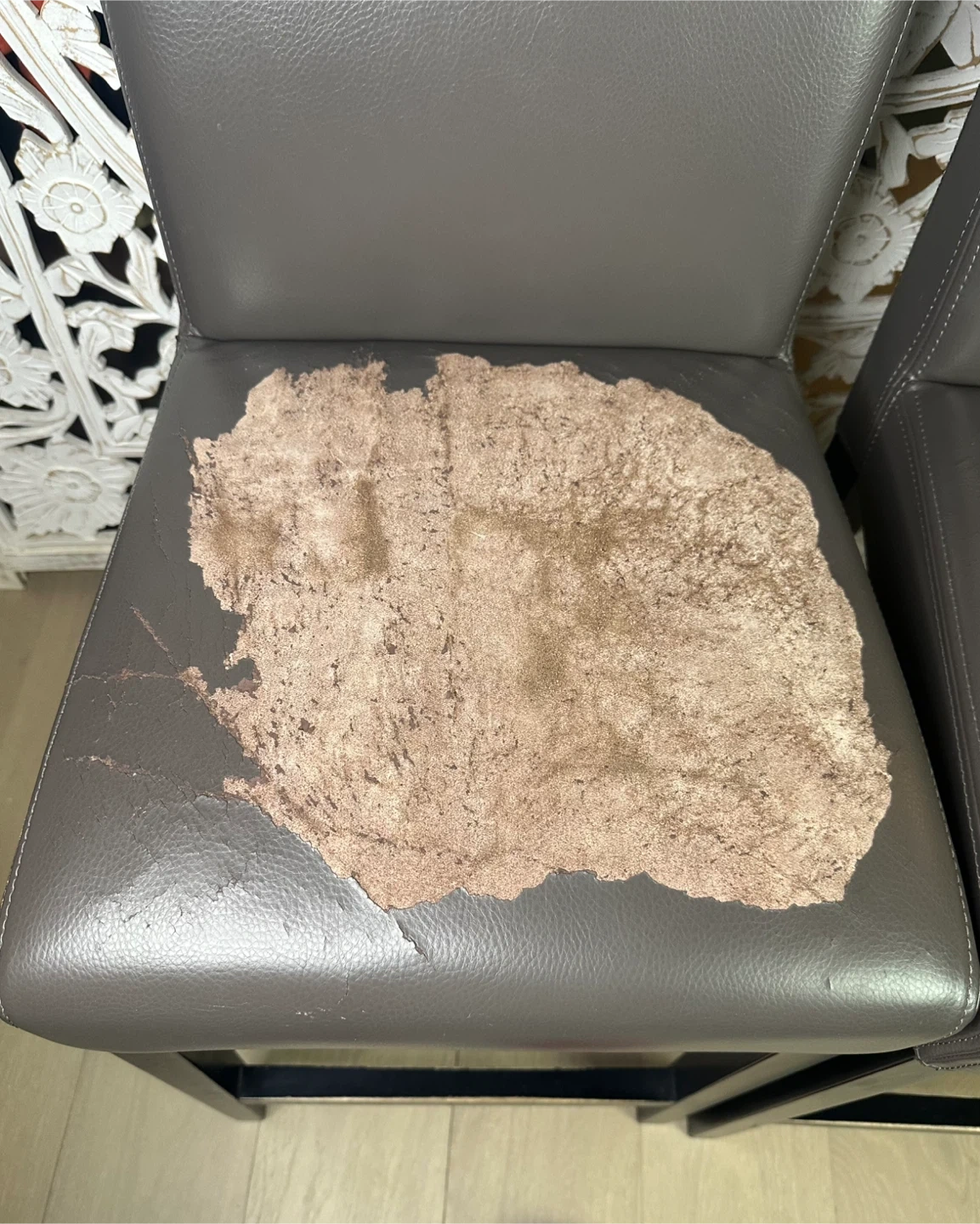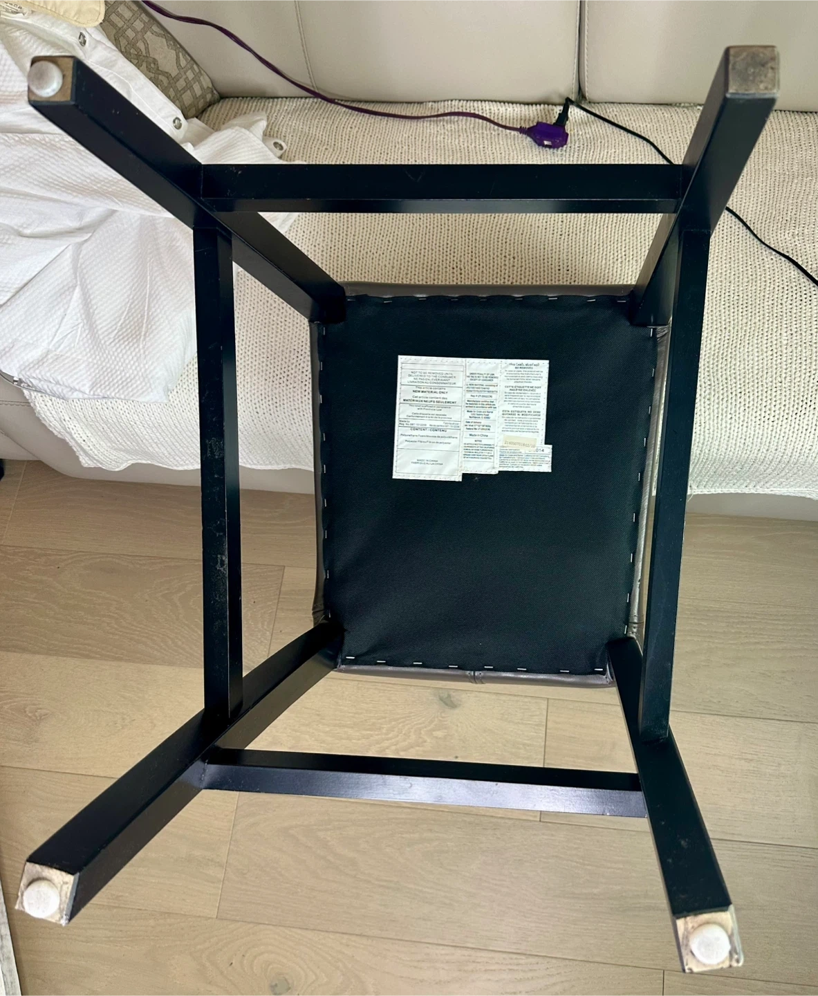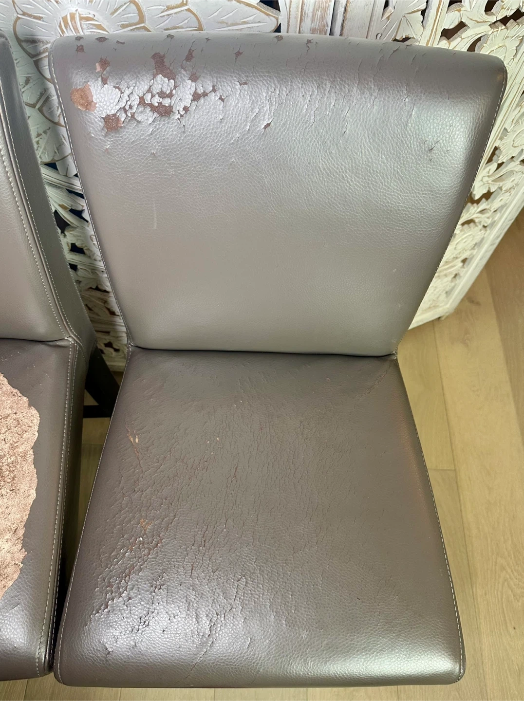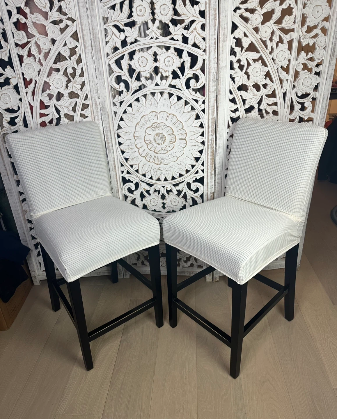 These are the most comfortable counter stools I’ve ever used! They feature a Smoke Grey leather finish, though the surface has cracked and peeled in places. I’ve been using them with Ivory slipcovers, which completely hide the issue. The slipcovers are stretchable, washable, and additional colors are available online if you want to change the look.