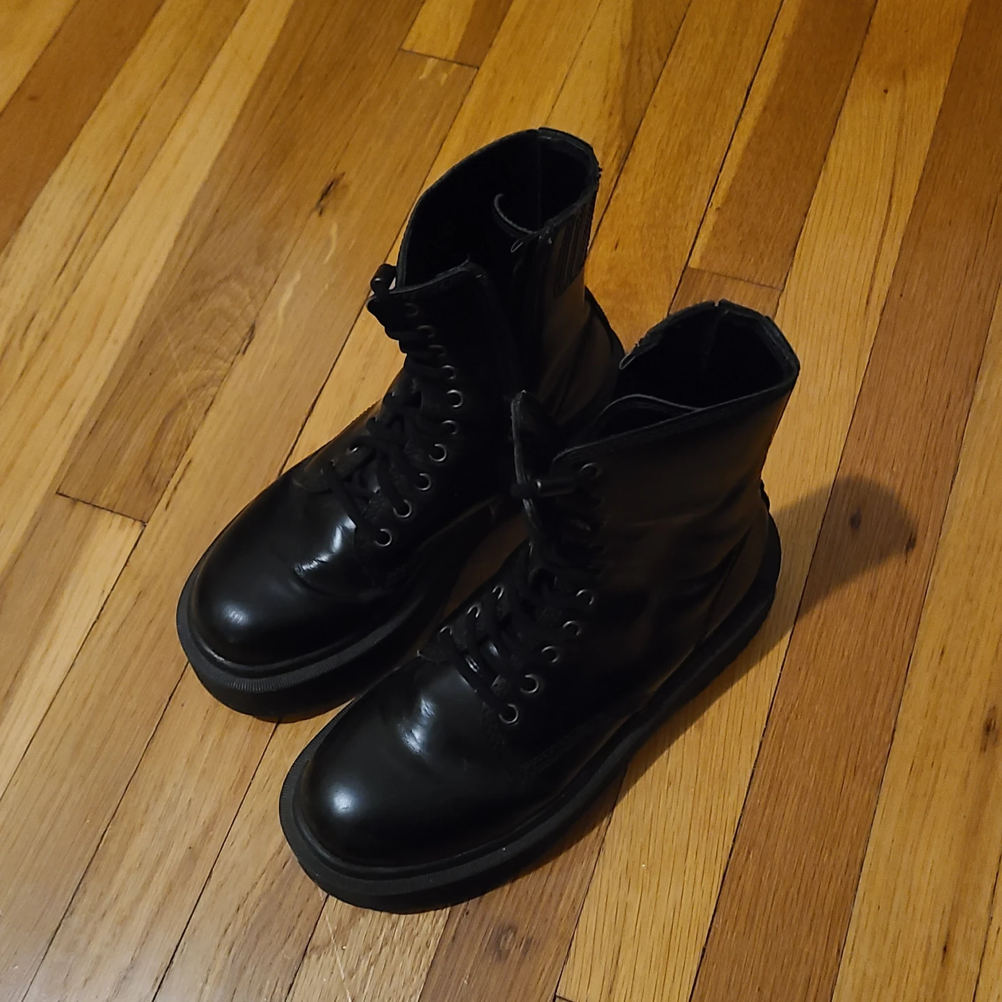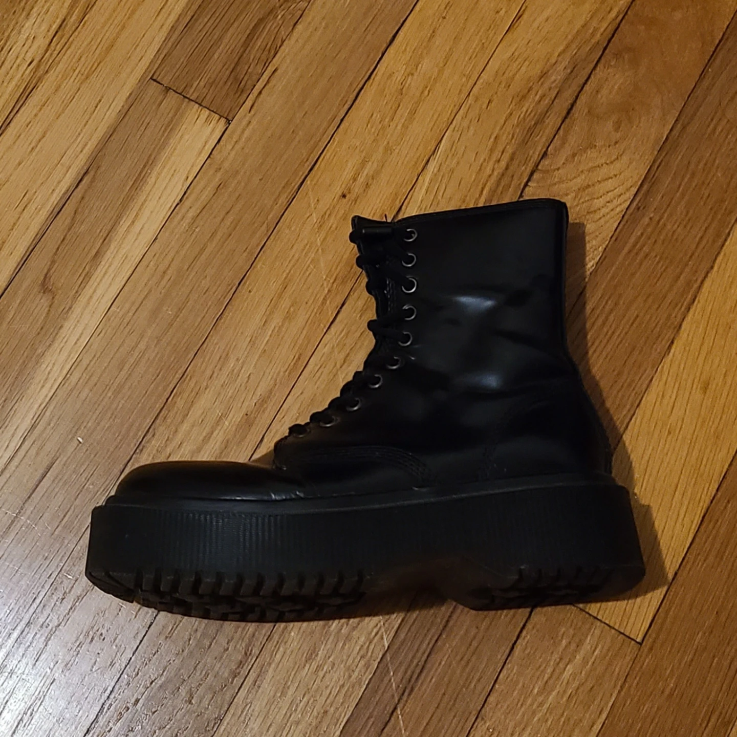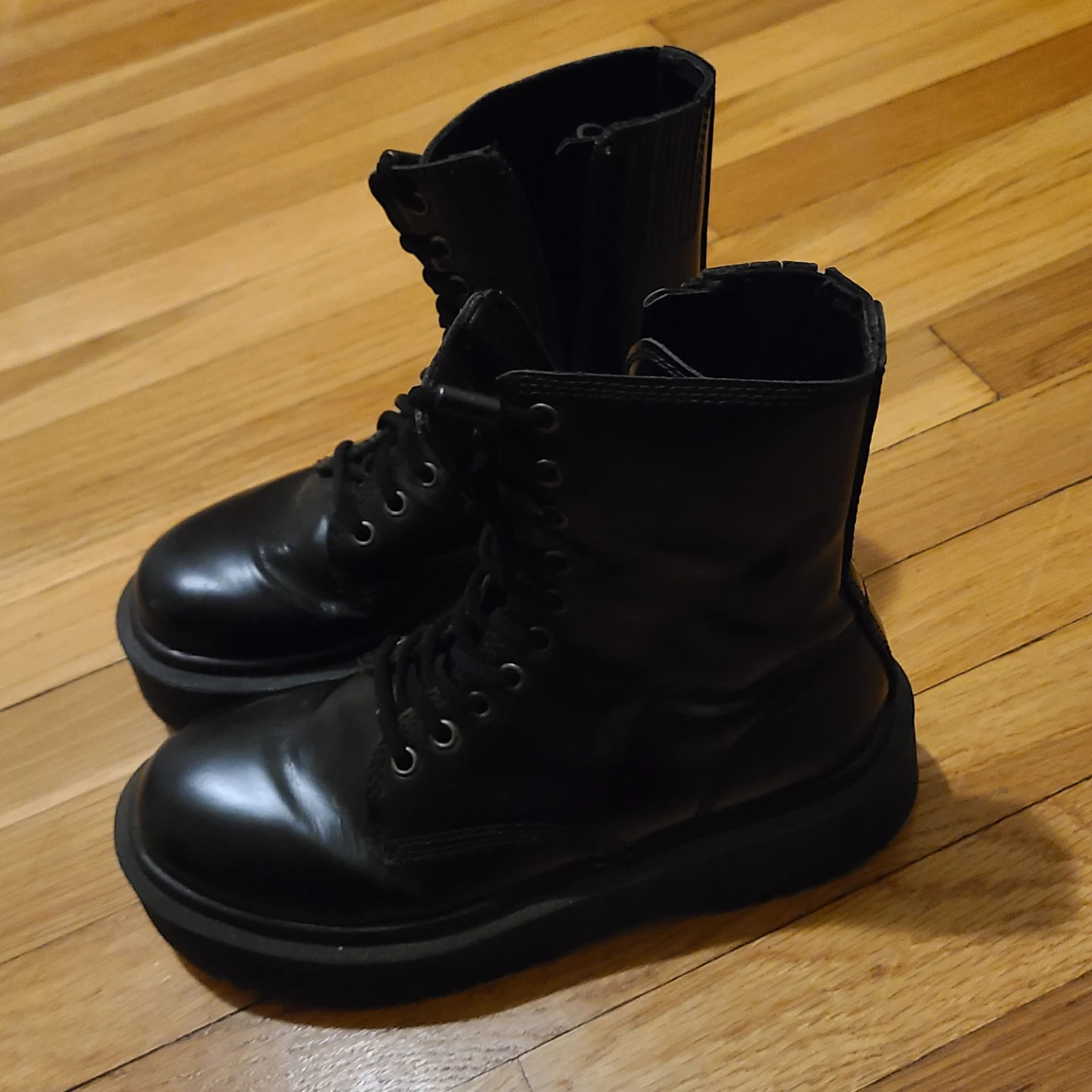 Selling a pair of black platform boots in clean condition with minor wrinkles shown on photo. They're a stylish and pretty comfortable for the style of boots it is. Size approx womens 7~8.