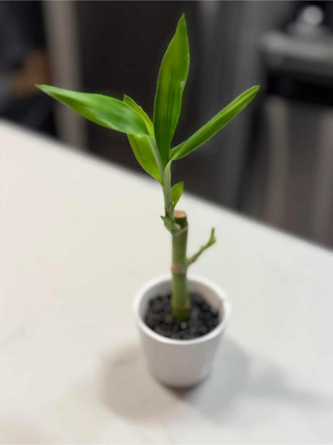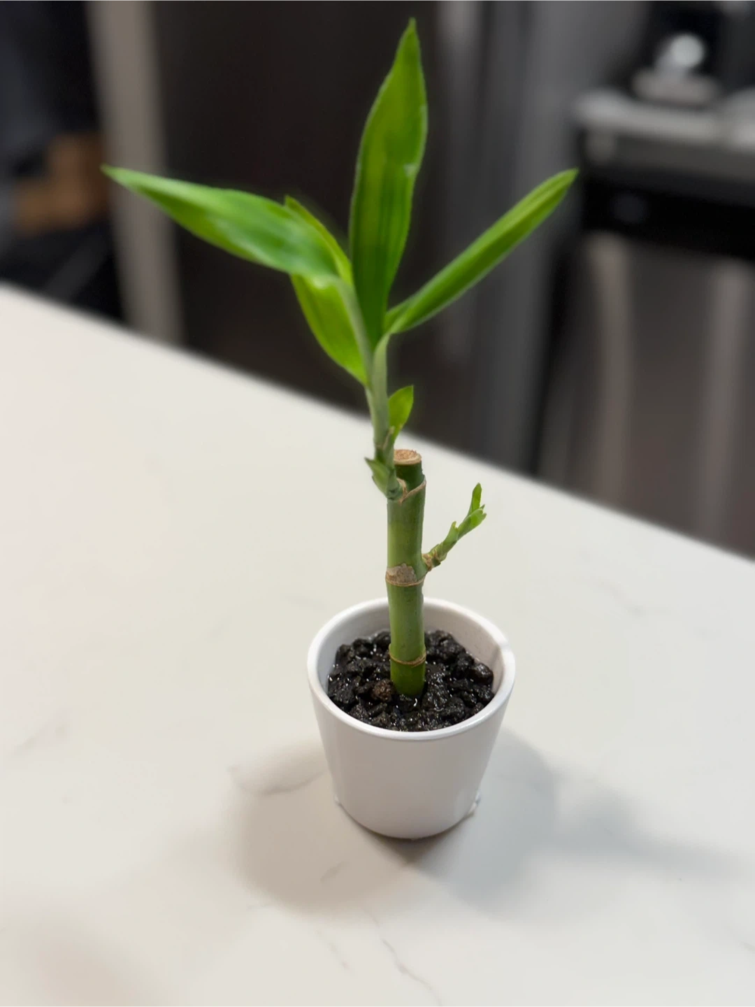 A cute little lucky bamboo plant in a white pot! Perfect for adding a touch of green to your space