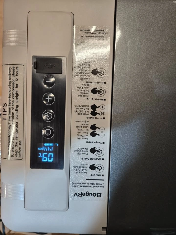 What You Get: The CR22 12V refrigerator comes with a package that includes a DC power cord, 6.56 ft AC power cord, and user manual. With Compressor refrigeration technology, this 12v car refrigerator could achieve 15 min fast cooling from 77 to 32 and 50 min from 77 to -5 , keeping your food fresh. No ice needed, no food spoiled, money and space-saving. Dimension: 22.68*12.60*12.97 in, Weight: 22.27 lb, lightweight. With ECO energy saving mode, this 23 Qt portable refrigerator's operating power is less than 36W. Even running on MAX mode(45W), it consumes far less than 1kWh/day for its intelligent cycle work. You can run this portable freezer fridge with 12/24V DC power on various vehicles, such as SUVs, Trucks, RVs, Camper, Van, Boat, etc. The truck freezer is designed to run with low noise to make sure you have a good sleep after long driving. This camping fridge also has a shock-proof design to face the uneven road, operating with no problem in case of a 30 inclination when you are off-road. The RV fridge/freezer is equipped with a 3-level battery monitor to prevent the fridge from draining your vehicle's battery. You can choose at what battery voltage the fridge shuts off to prevent complete battery drain. NOTE: Please do not place the refrigerator in direct sunlight, as this may cause the refrigerator door to become deformed.