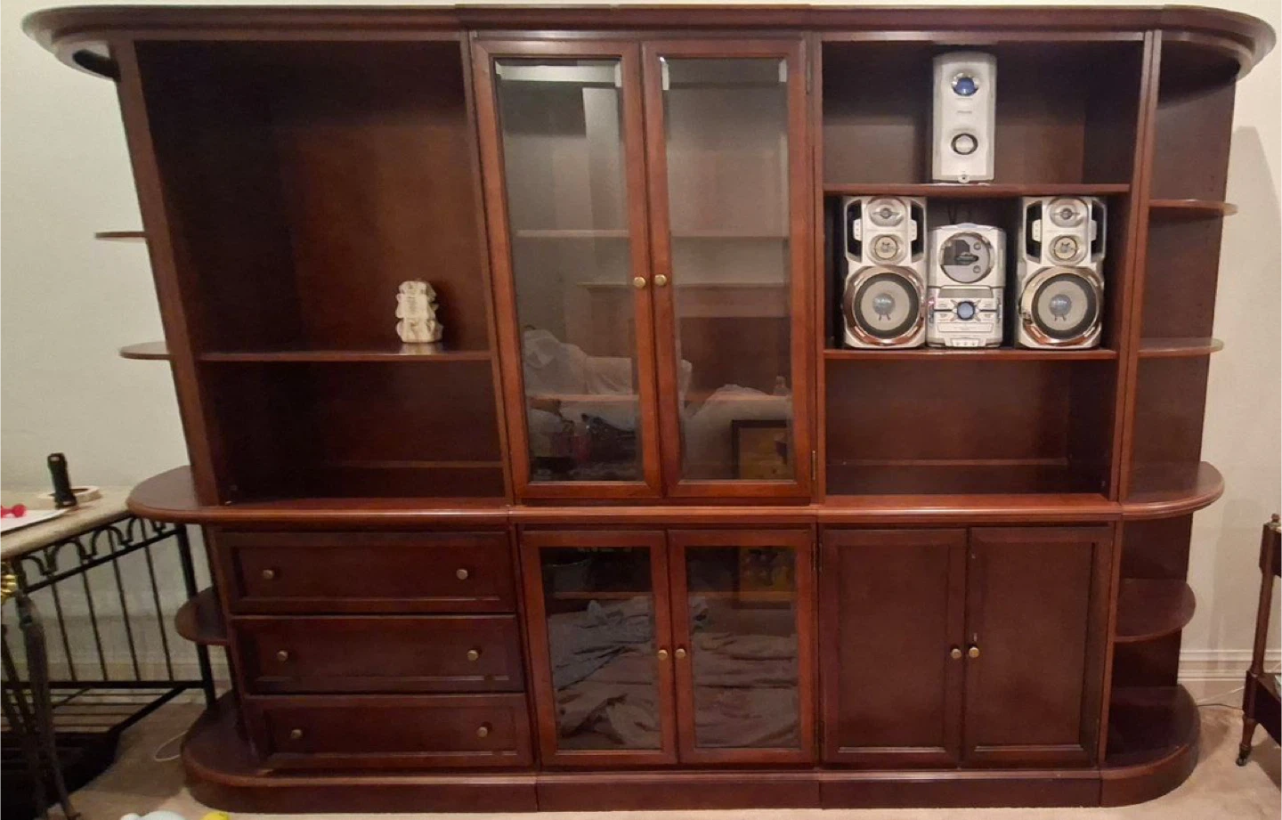 Selling a wooden entertainment center in good condition. It features glass doors, drawers, and open shelving for storage and display. Perfect for organizing your media and adding a touch of elegance to your living space