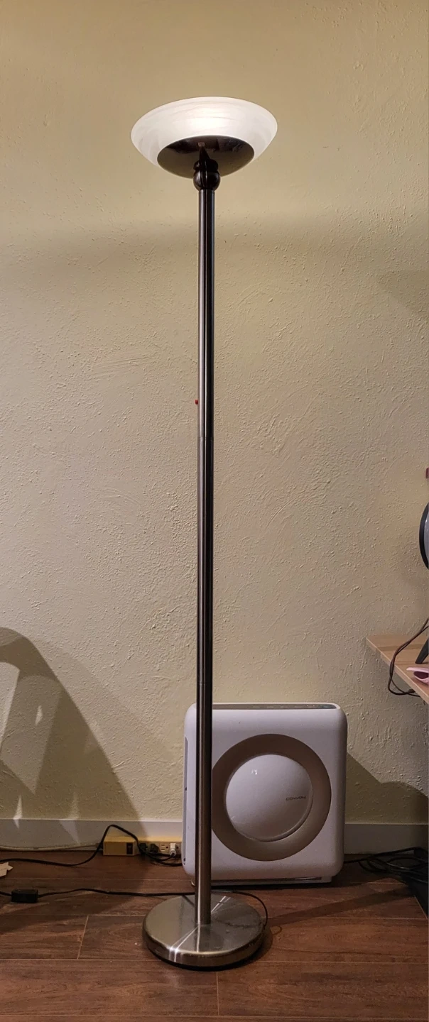 The lamp is well built and has a weight to it. Has a frosted glass shade that diffuses light beautifully. 72 inches or 6 feet tall.