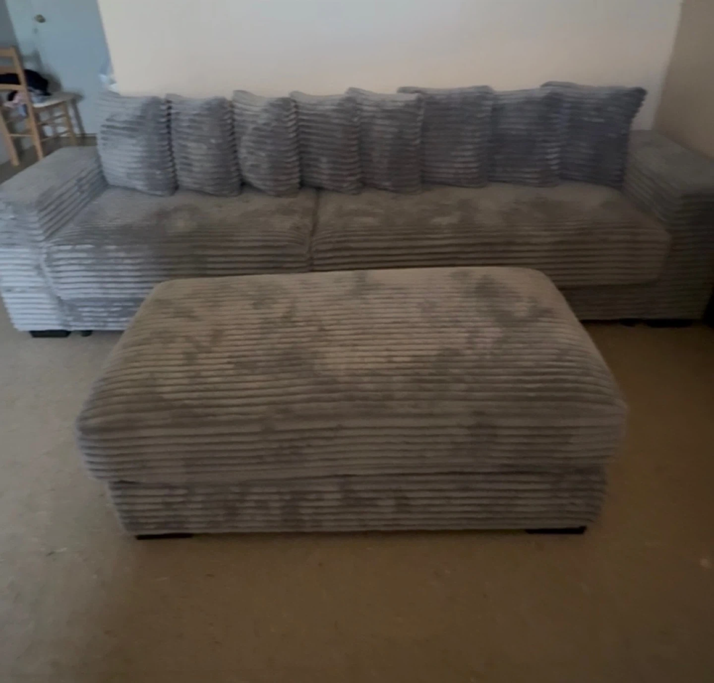 Selling a comfy light gray corduroy sofa with a matching ottoman! It's in great shape and ready for a new home. The actual color is light gray, and it's super cozy!