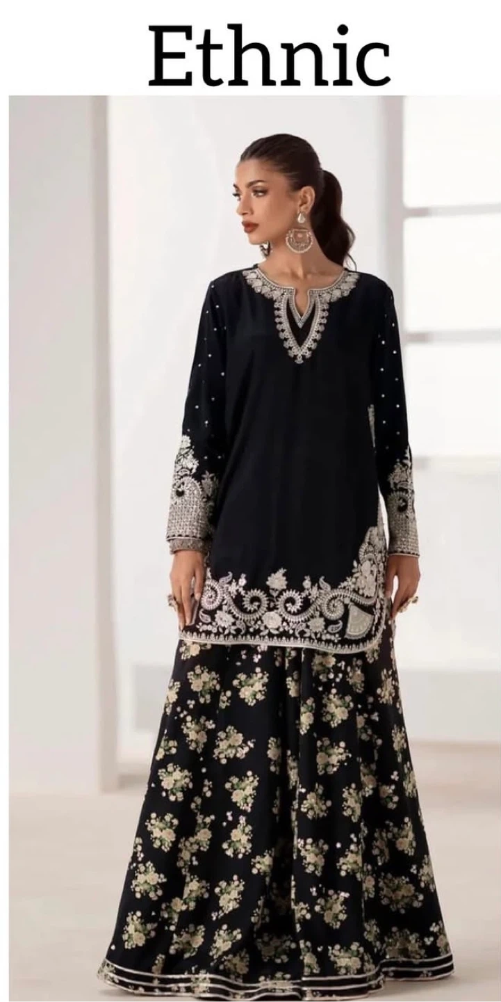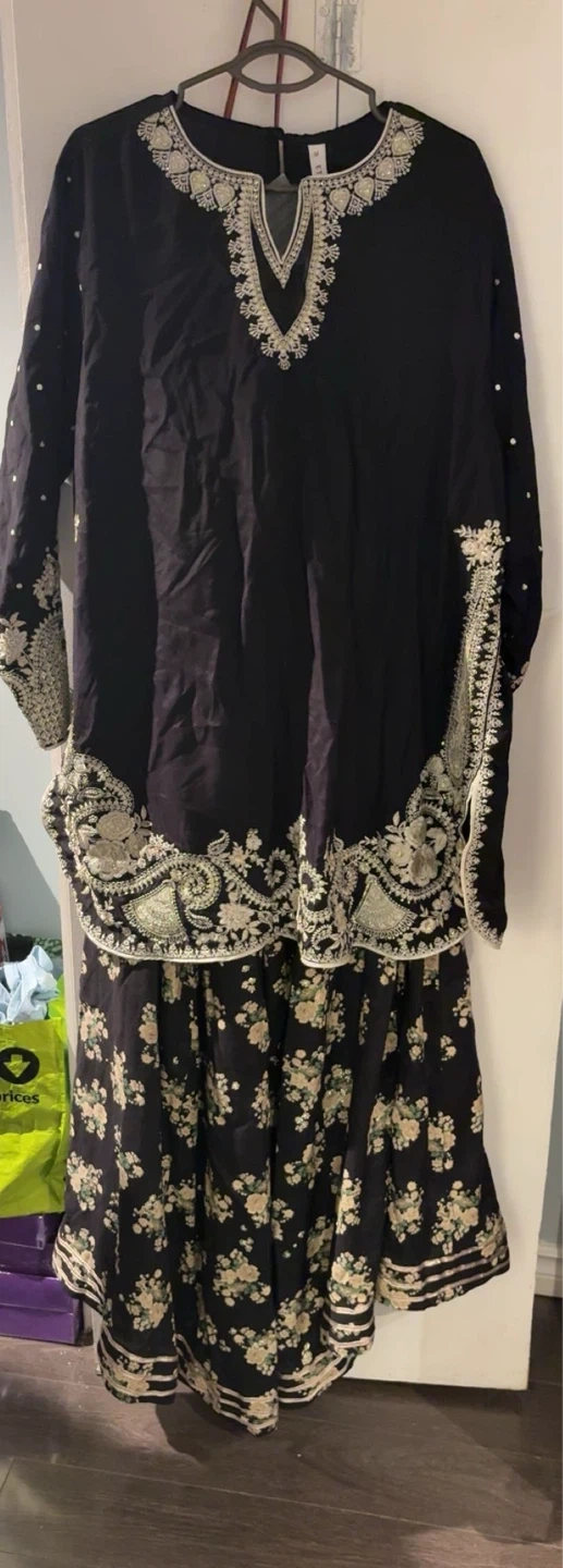 A lovely blue salwar kameez suit set with intricate embroidery and a floral skirt. Perfect for a special occasion or just feeling a bit fancy!