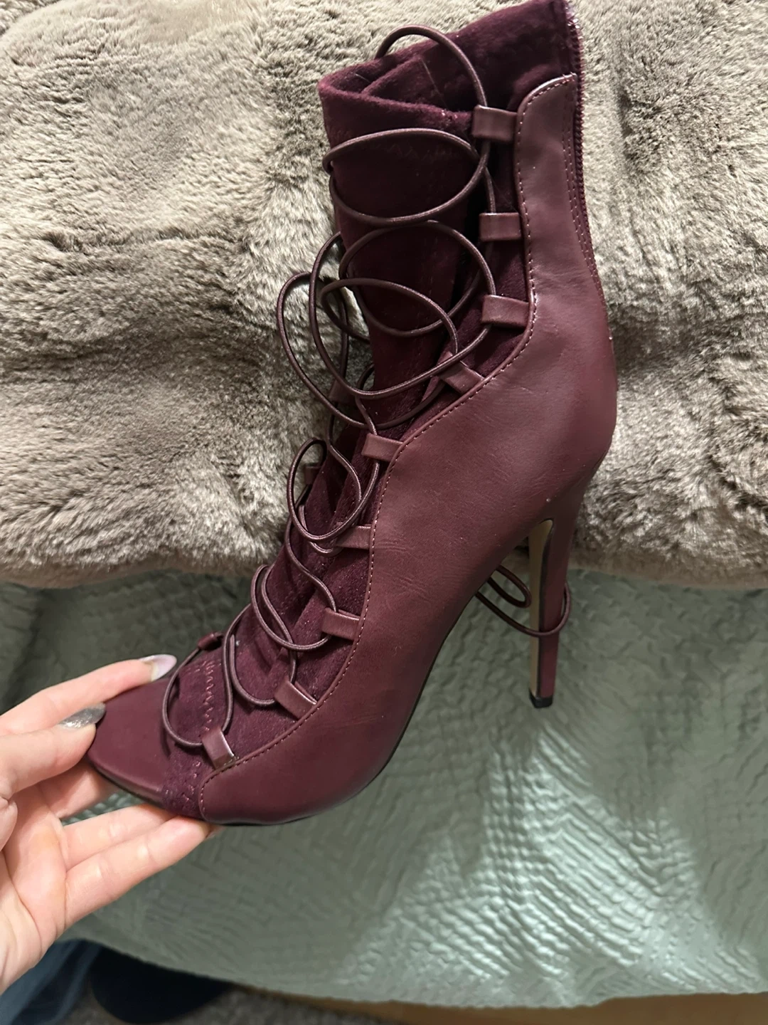 Stylish ShoeDazzle burgundy lace-up heels! These heels are perfect for a night out or a special occasion. They feature a unique lace-up design and a sleek silhouette. Great condition!