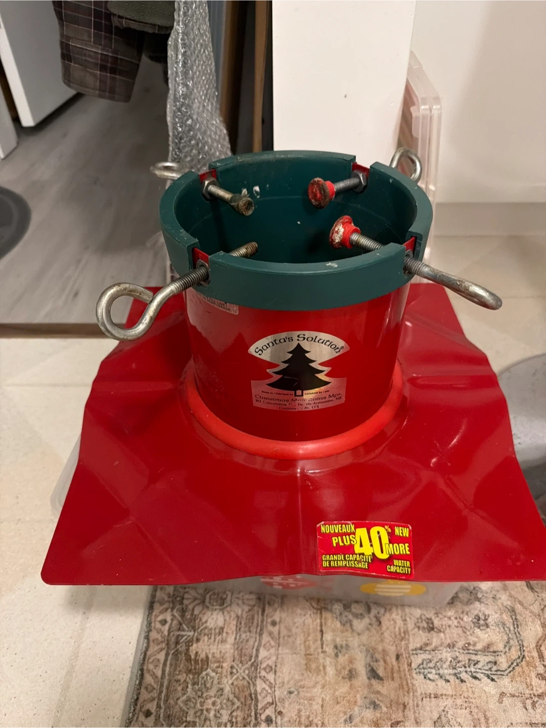 Selling a Santa's Solution Christmas tree stand! It has a red base and green top and boasts a "Nouveaux Plus 40% New More Water Capacity"