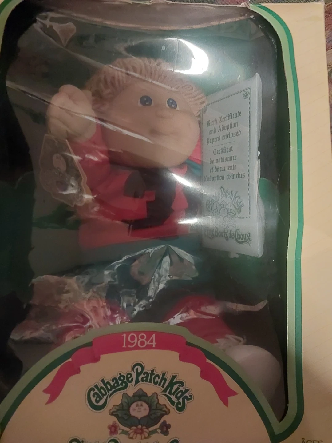 Selling a vintage Cabbage Patch Kid doll from 1984! This doll is in its original box, and includes its birth certificate and adoption papers. Boy doll named Jesse Aylwin born September 23rd 1984. Has both original outfit and shoes.The box has some wear and tear, but the doll has never been taken out of box and is in brand new condition. Great find for any collector!