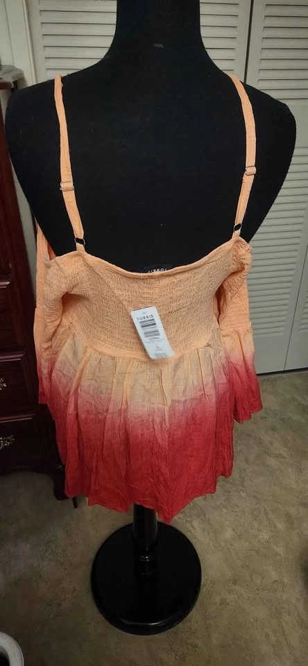 New Torrid top with adjustable straps and a flowy design. Gradient goes from peach at the top to red at the bottom. Has a smocked bodice and ruffled hem. Still has the tag attached. Retailed for 74.50