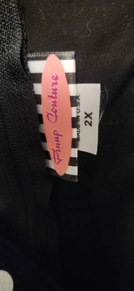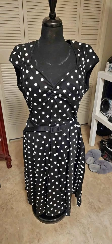 Black dress with white polka dots. V-neckline, short sleeves, and belted waist. Knee-length. Blame betty Pinup Couture brand, size 2X. Fits more like an xl. Like new condition. Worn once in 2012 for my convocation. Has sat in my closet since. Pick up huntington hills nw