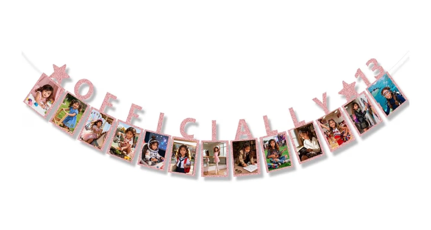 This is a cute 'Officially 13' photo banner, perfect for a 13th birthday celebration! It's designed to hold 6-inch photos and includes a ribbon for hanging. The banner pieces are approximately 25cm tall and 12.2cm wide.