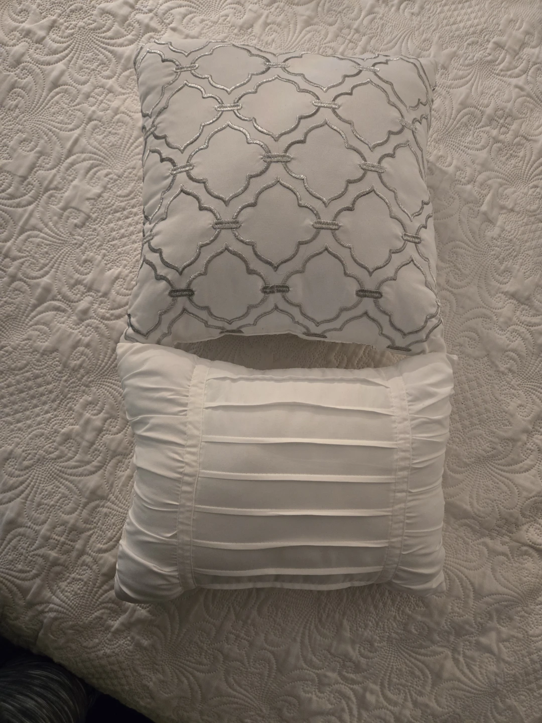 Selling two white decorative pillows. One is square with a silver geometric pattern, and the other is rectangular with a pleated design. Perfect for adding a touch of elegance to your home decor!