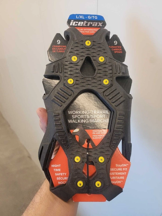 Get a grip on winter with these Icetrax traction cleats, designed in size L/XL for working, sports, and walking in icy conditions. These cleats feature 9 tungsten carbide spikes for enhanced stability and reduced risk of slips and falls. These cleats are used, with minimal wear.