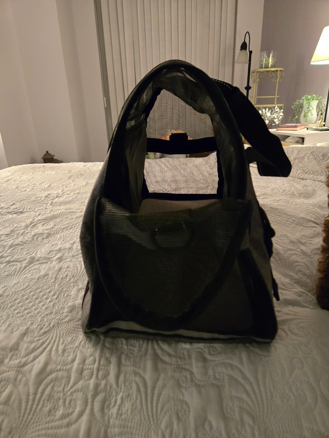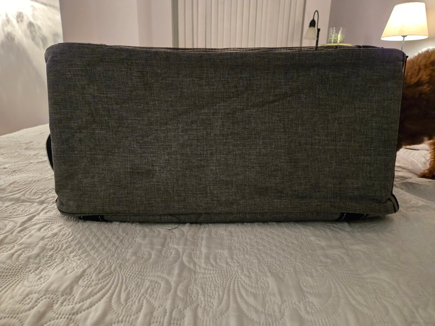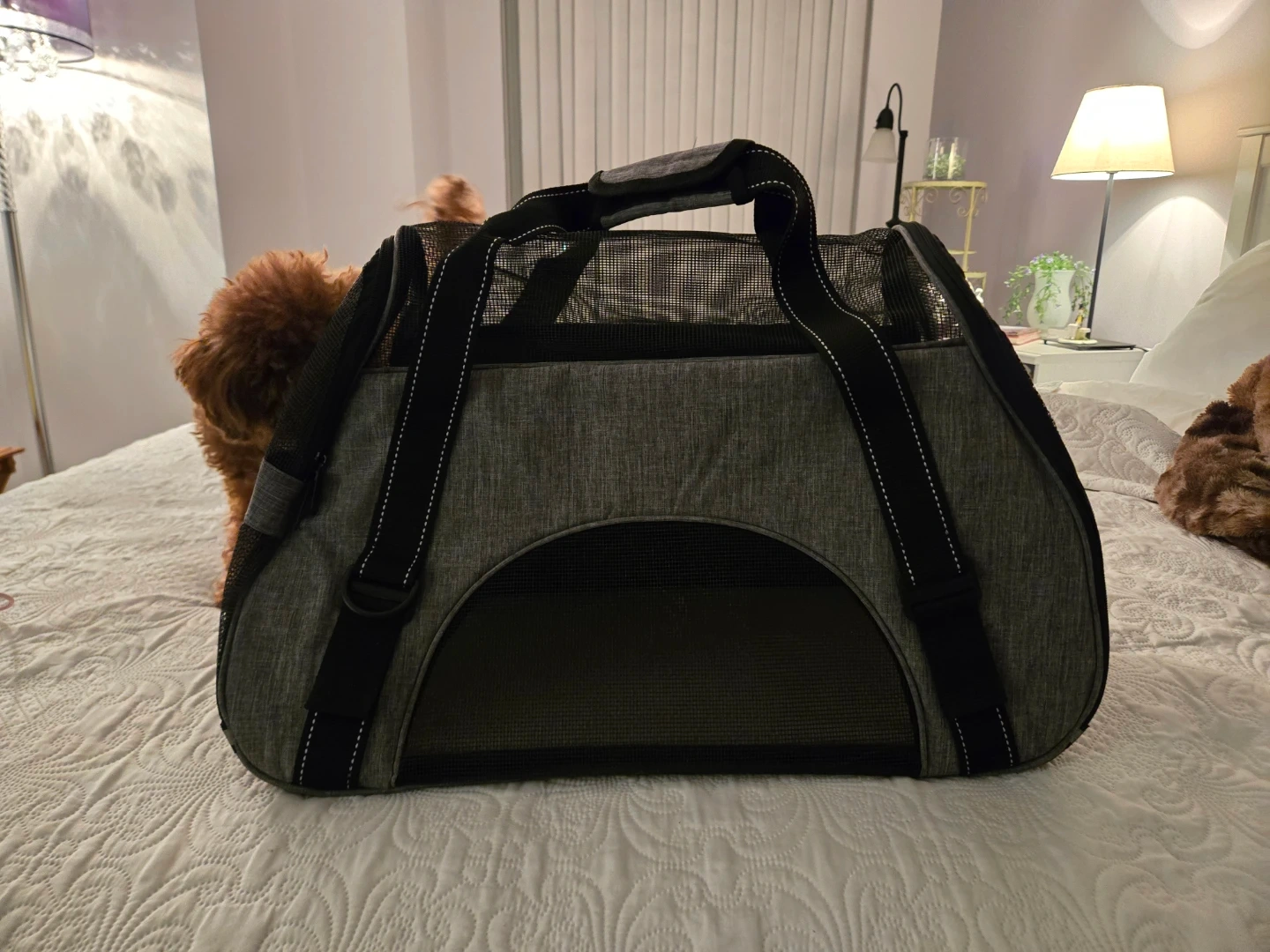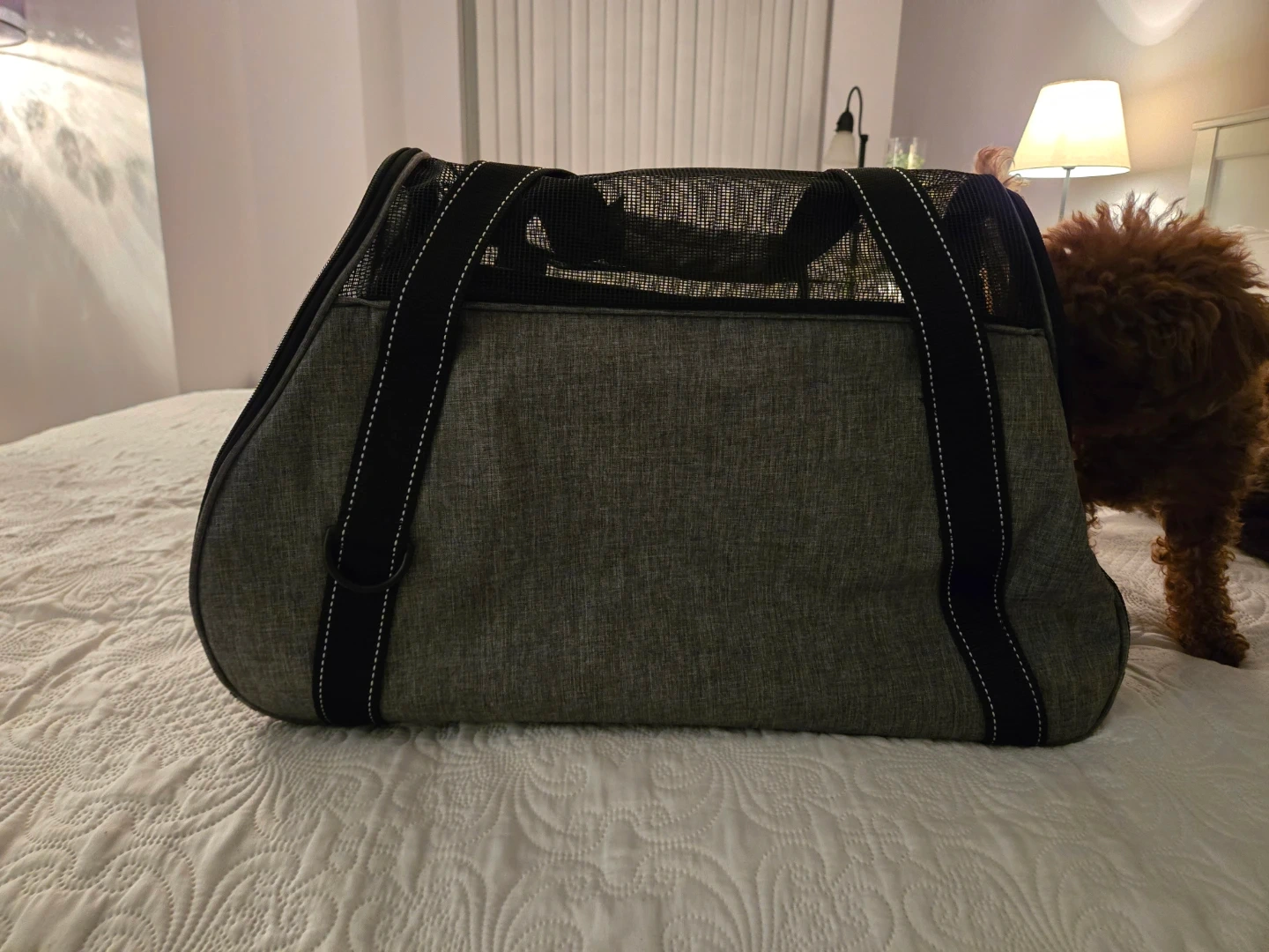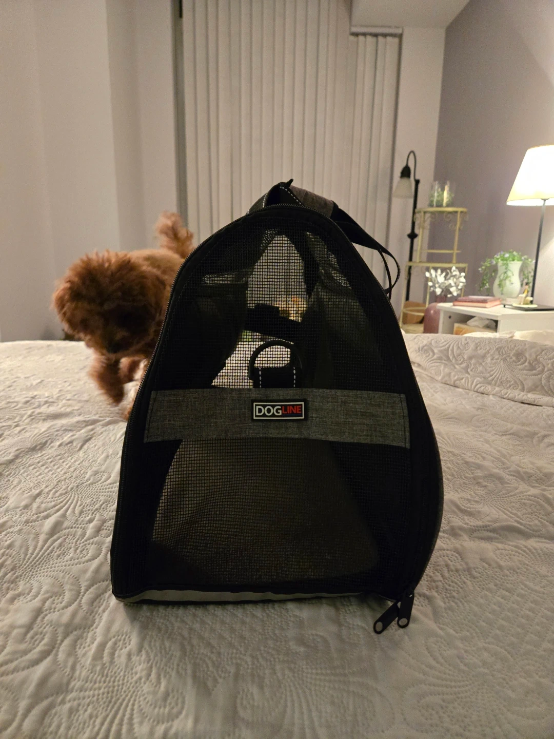 Dogline pet carrier in great condition! It's a stylish and practical way to bring your furry friend with you. The carrier is grey with black accents and has mesh windows for ventilation. Perfect for small dogs or cats! My dog loved it - as shown in the pictures:)