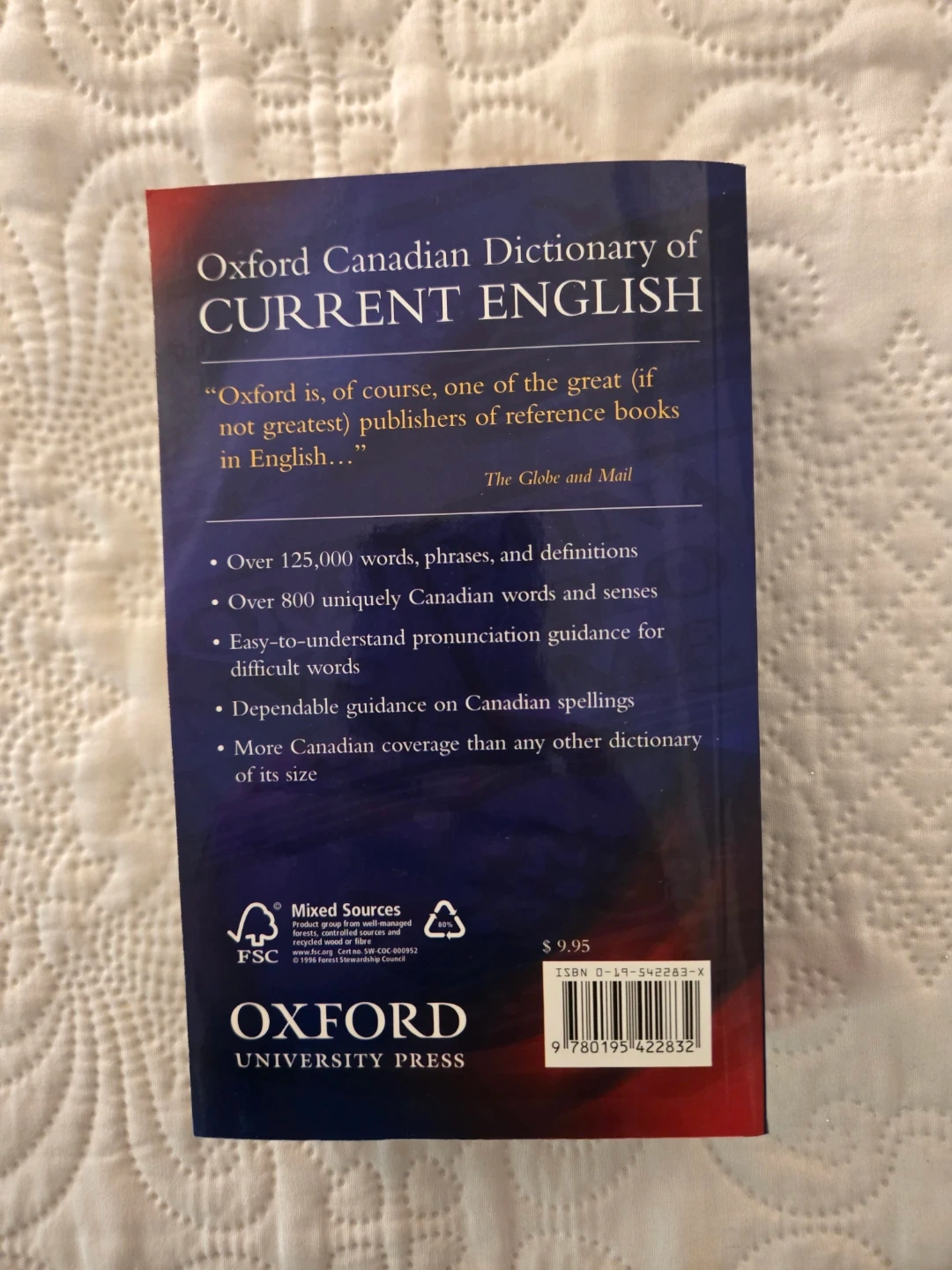 Selling an Oxford Canadian Dictionary of Current English! It's a great resource for anyone looking to improve their understanding of Canadian English. It includes over 125,000 words, phrases, and definitions, with over 800 uniquely Canadian words and senses. It also offers easy-to-understand pronunciation guidance and dependable guidance on Canadian spellings