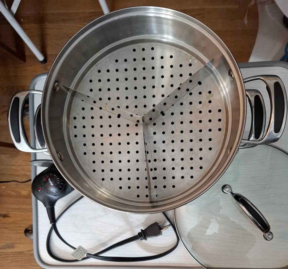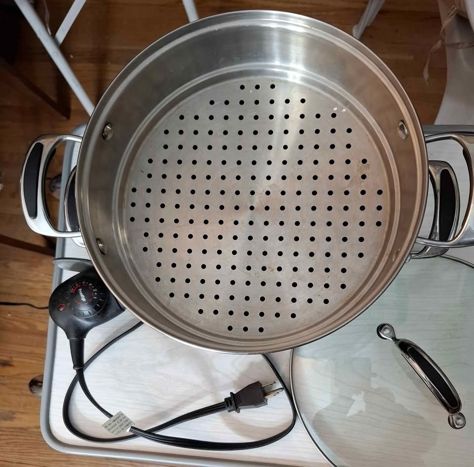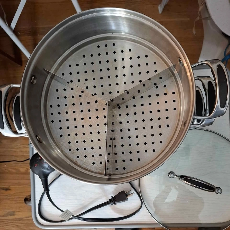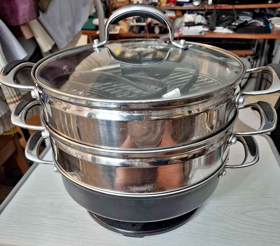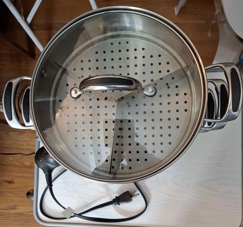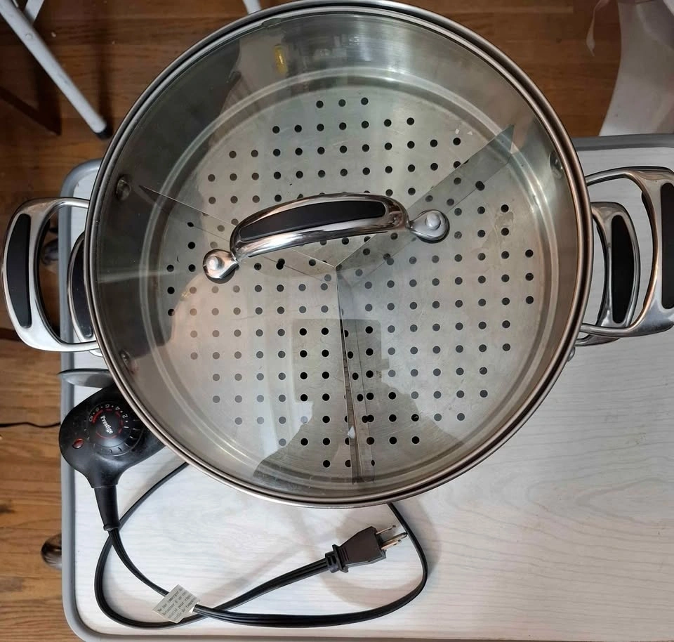 Electric stir fry and multi level veggie steamer with compartment dividers to steam different veggies at the same time.