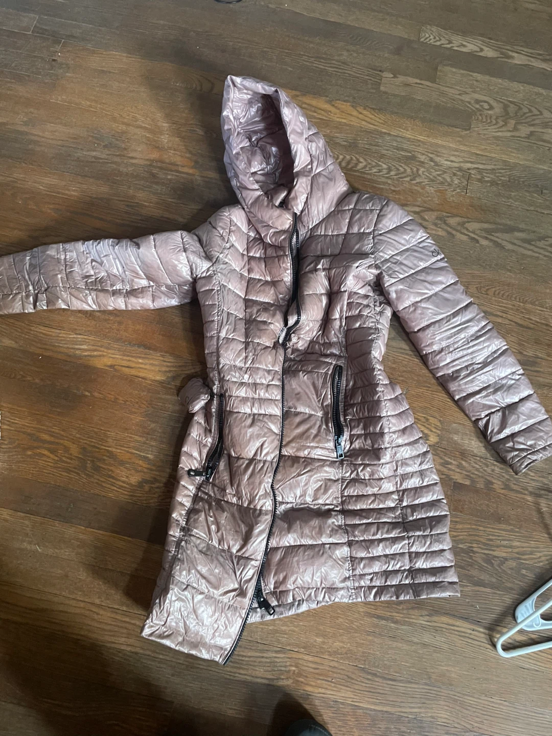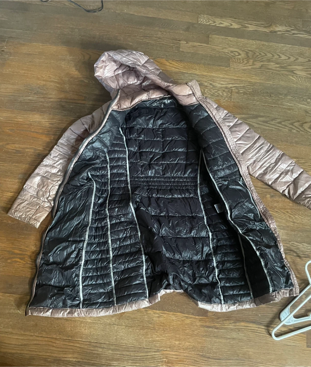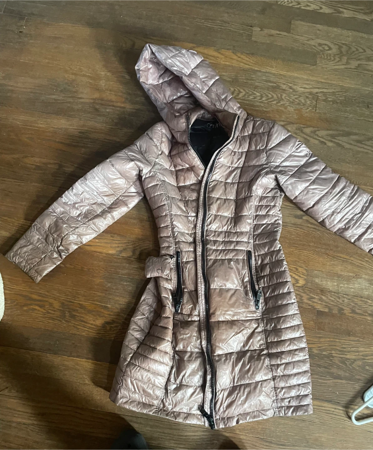 Selling a Calvin Klein hooded puffer coat. It's a light pink color with black zippers and a black interior. It's in great condition and ready for a new owner!