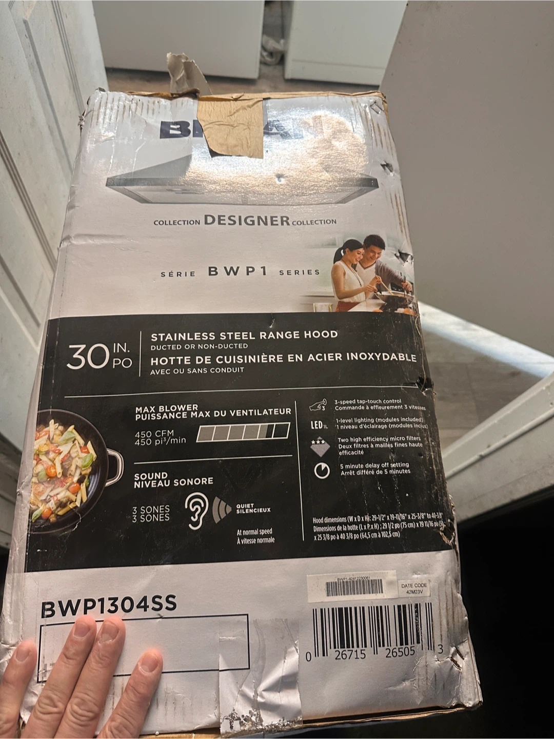 Selling a Broan Designer Collection BWP1 Series stainless steel range hood. It's a 30-inch ducted or non-ducted model. Features include a 3-speed touch control, LED lighting, and two high-efficiency micro filters. It has a quiet speed setting.