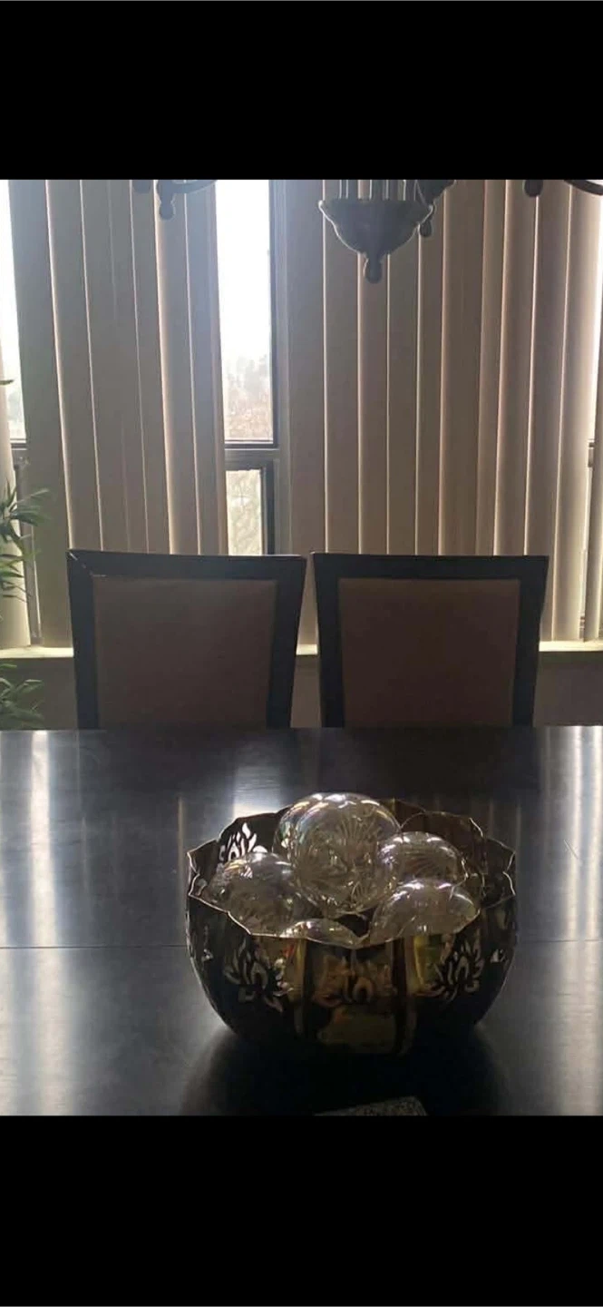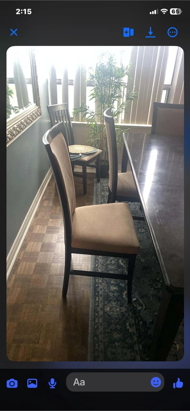 Selling a set of 8 dining room chairs. They're in fairly condition and ready to add a touch of elegance to your dining space. One needs to be re-strengthened as it’s loose . Scratches and some worn off areas on wood ( natural use wear and tear ). Some water stains that can be steamed out . I can send pics . Price includes all 8 chairs .