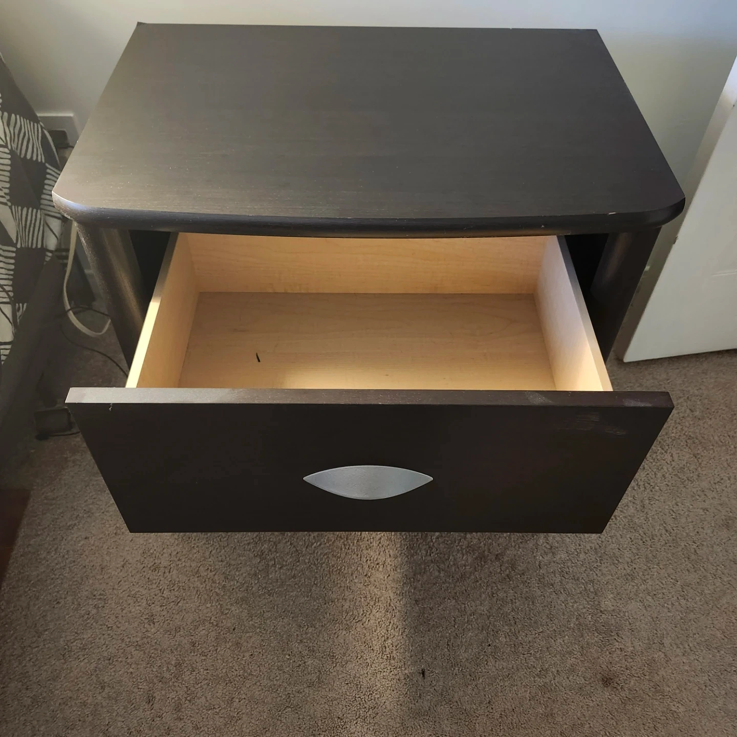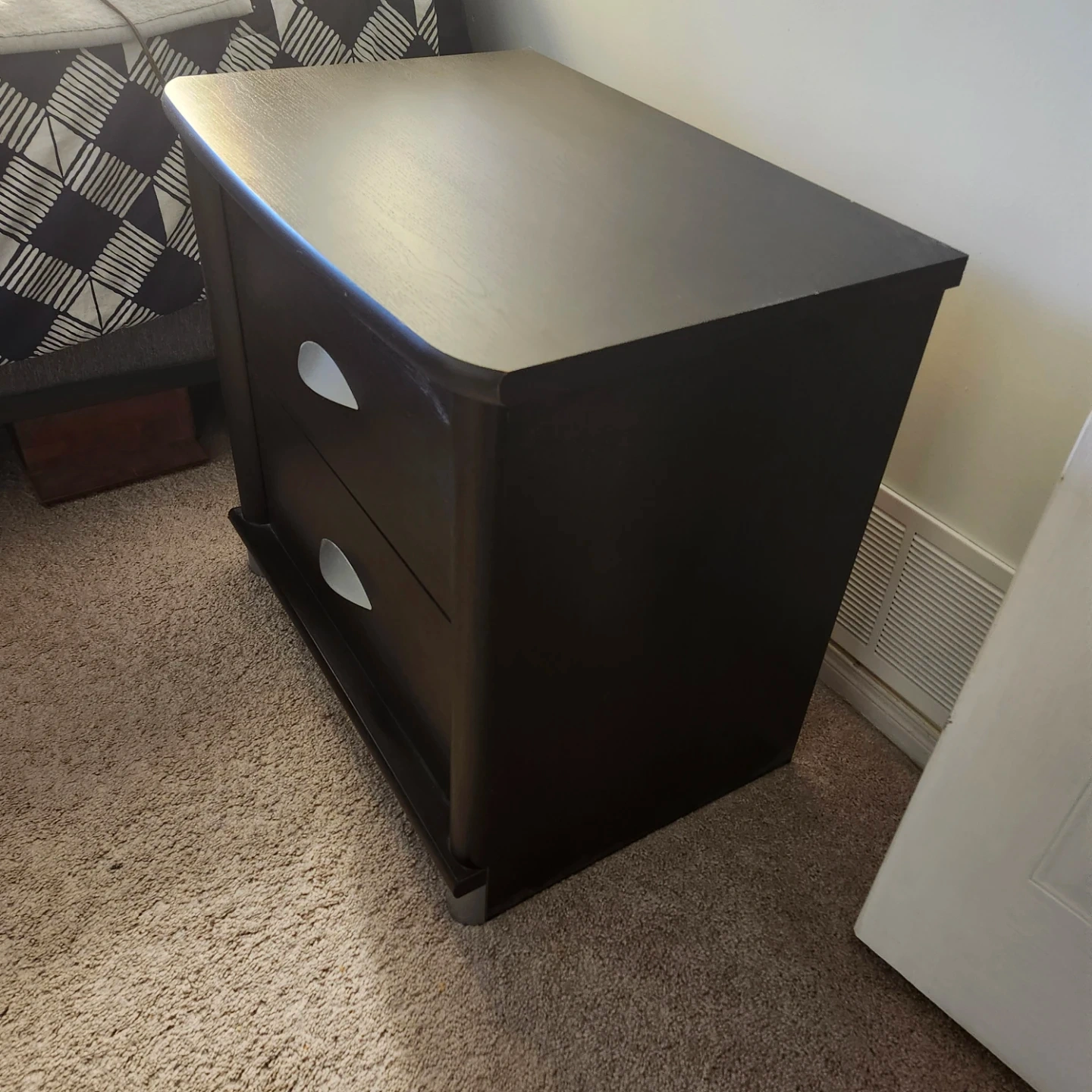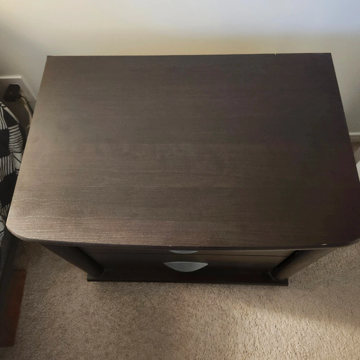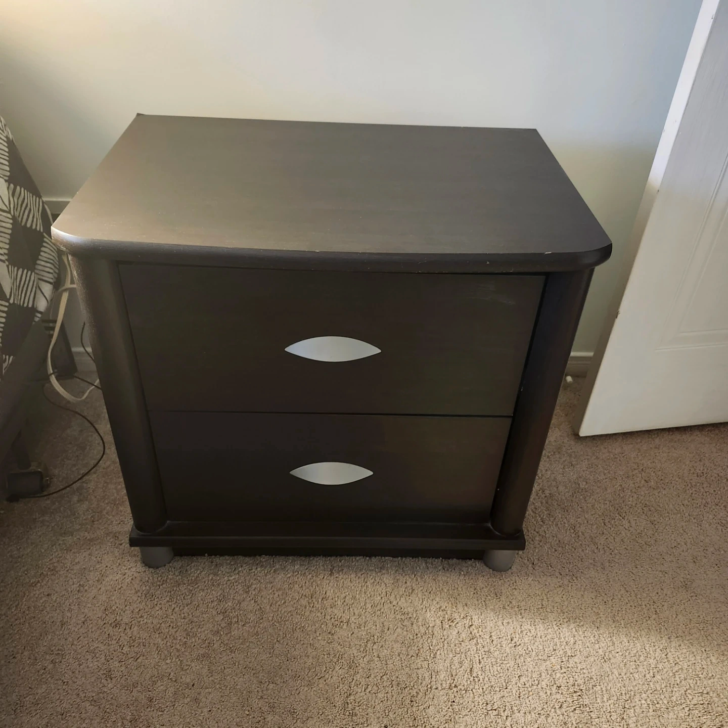 Selling a gently used dark brown nightstand with two drawers. It's in good condition and ready for a new home!