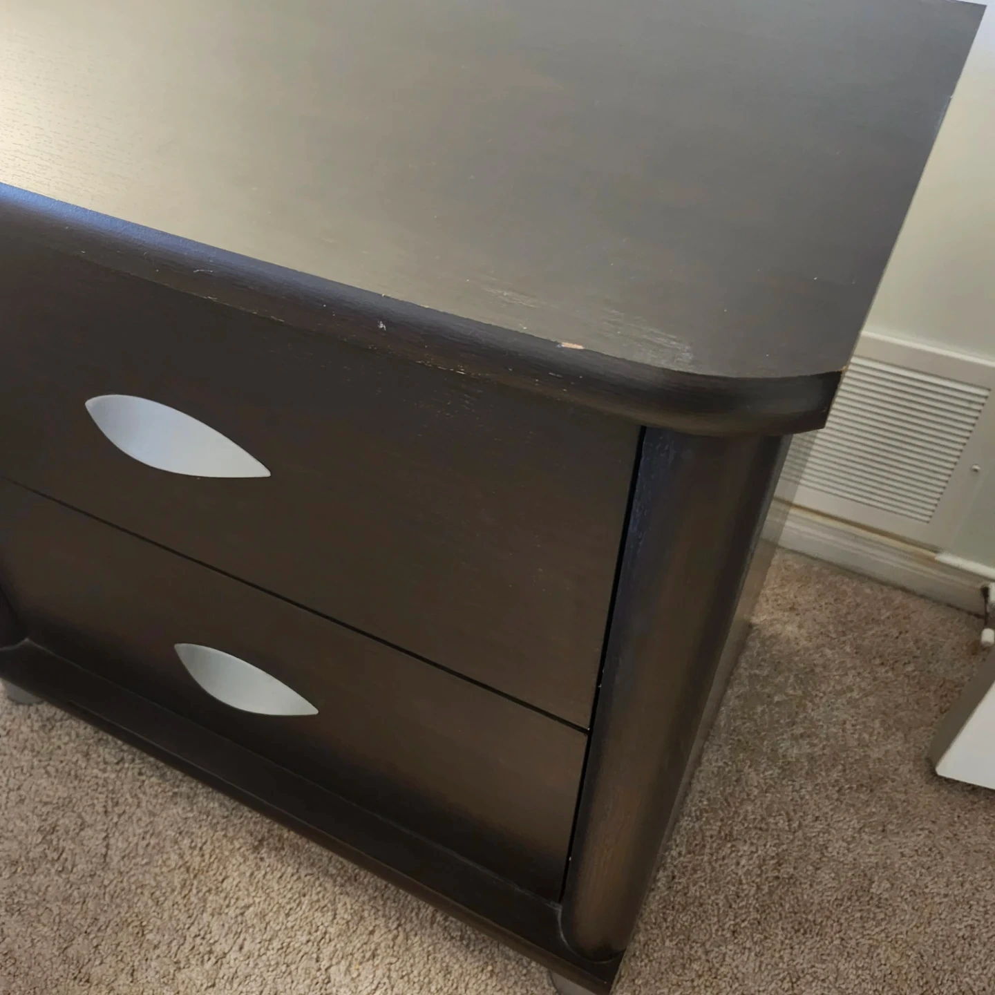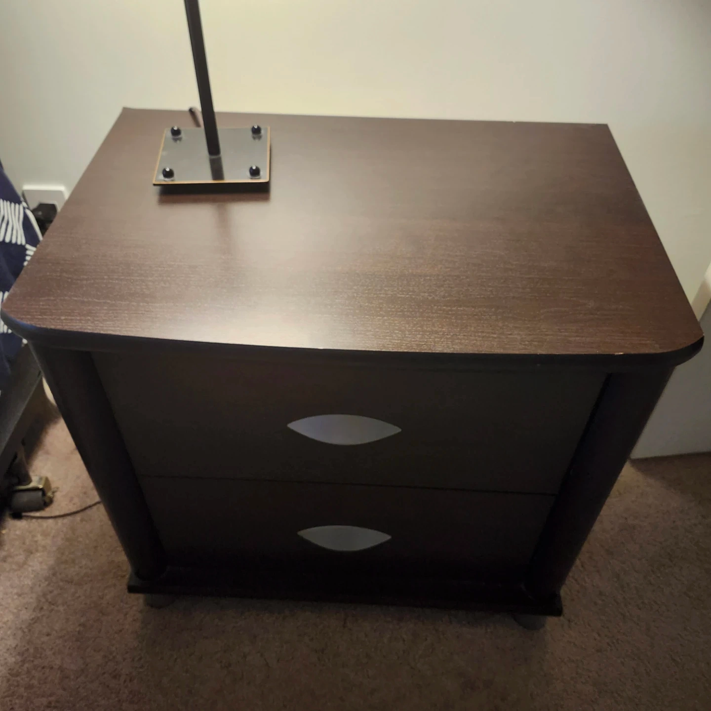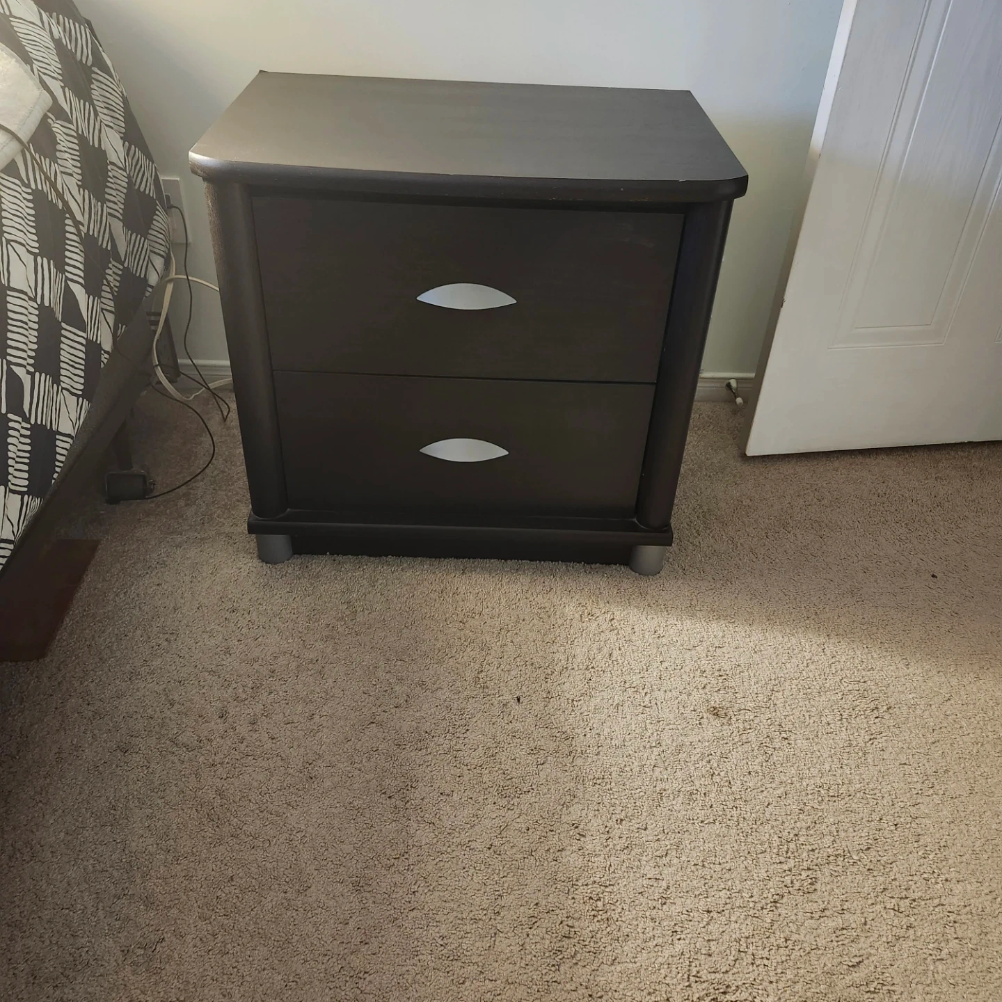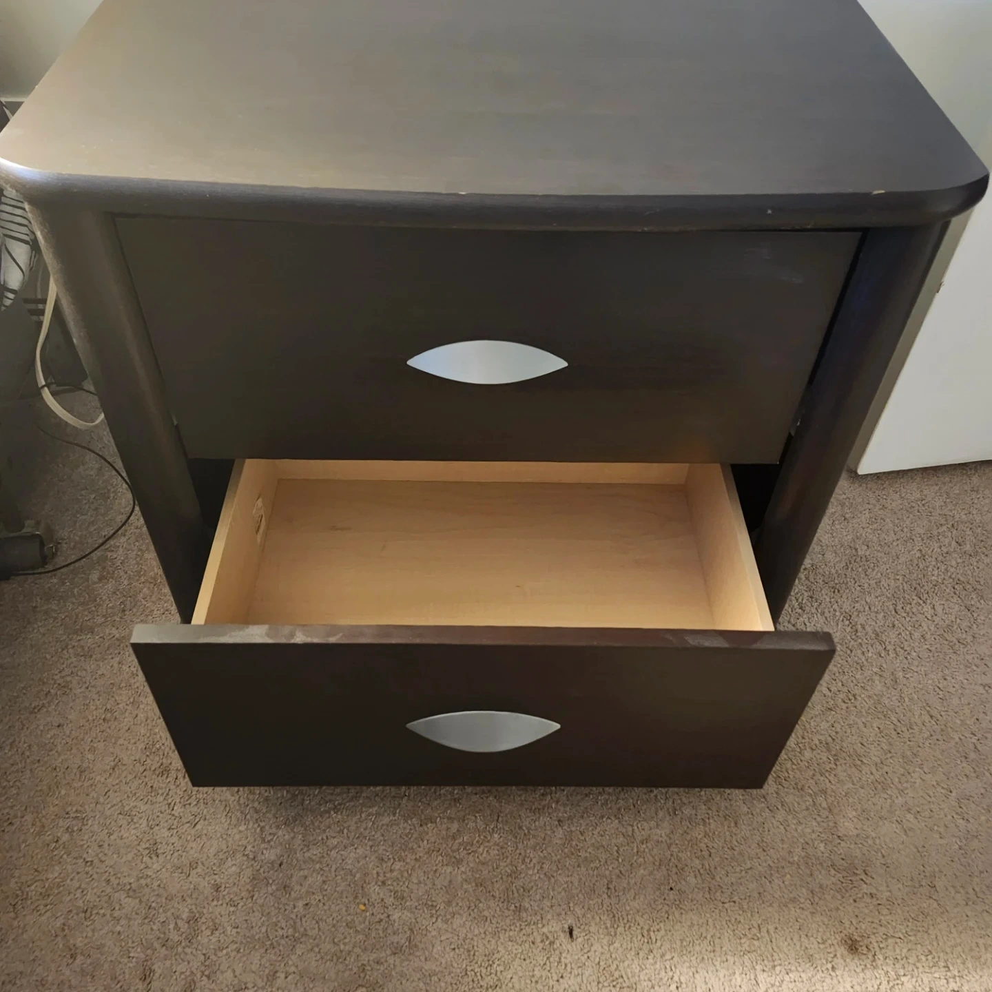 Selling a gently used dark brown nightstand with two drawers. It's in good condition and ready for a new home!