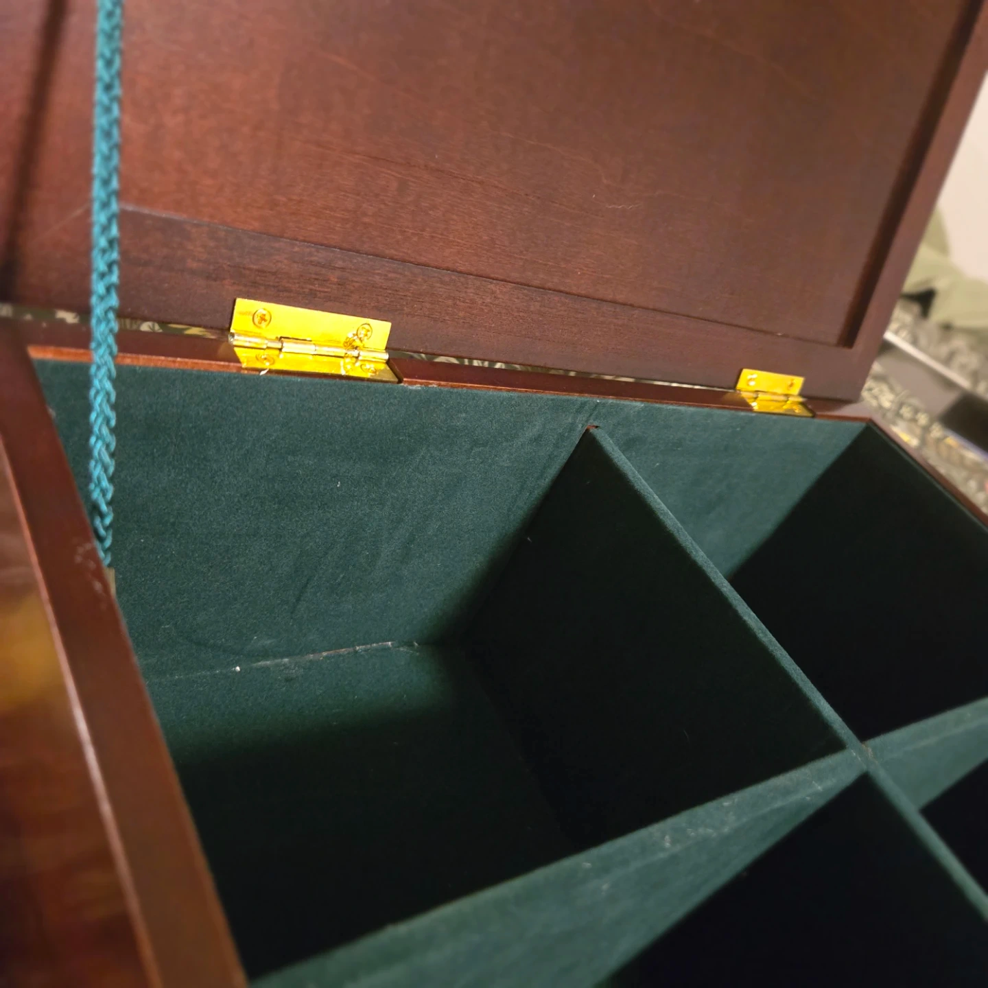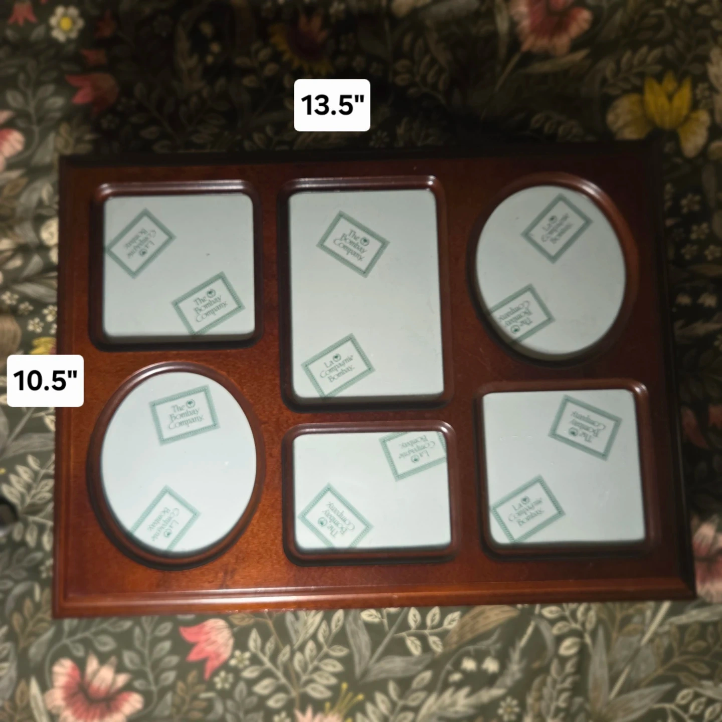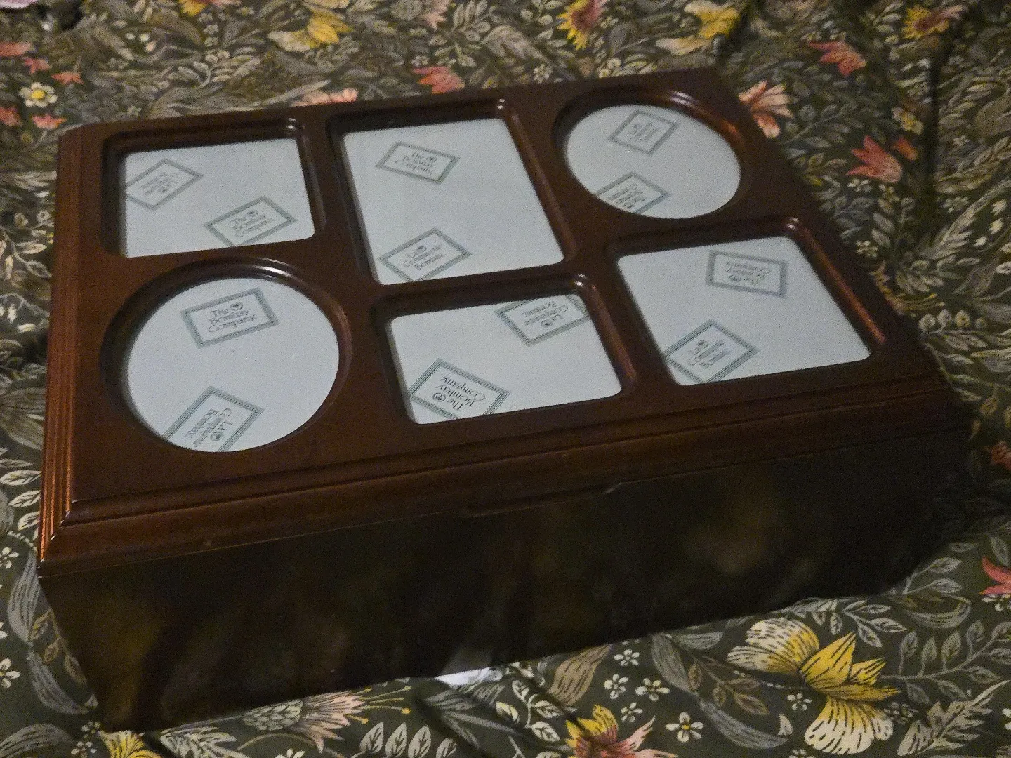 This is an original Bombay Company photo box with a dark brown finish and a green felt interior. It has spaces for multiple photos of various shapes and sizes. The box is in good condition and would be great for storing and displaying your favourite memories
