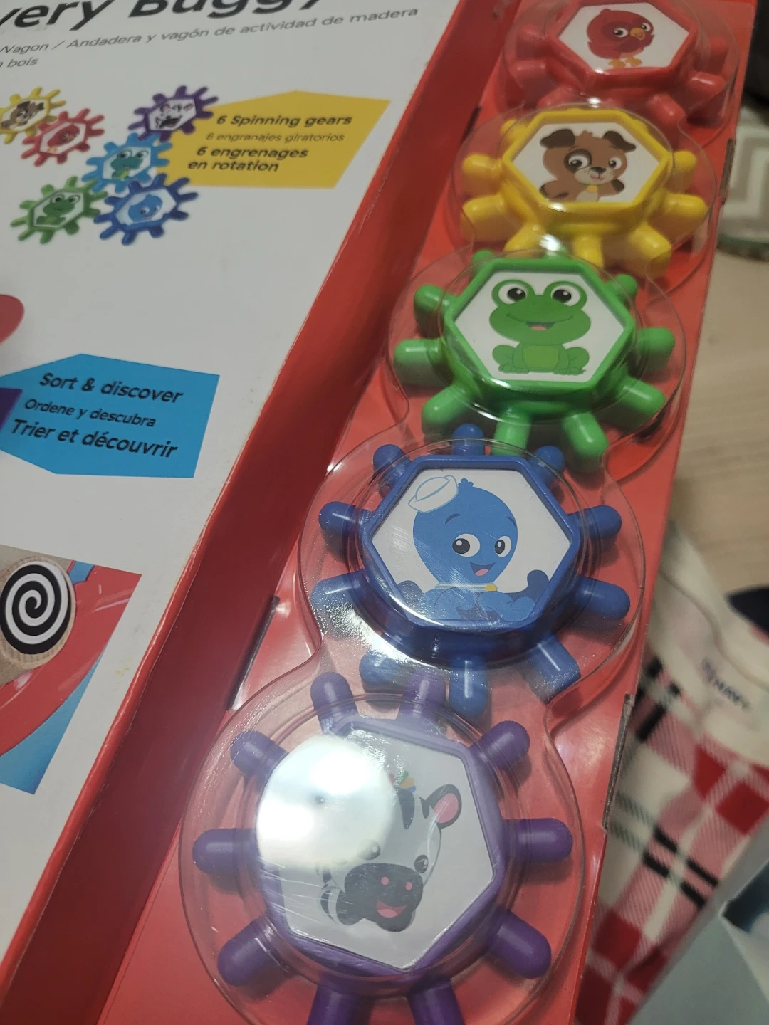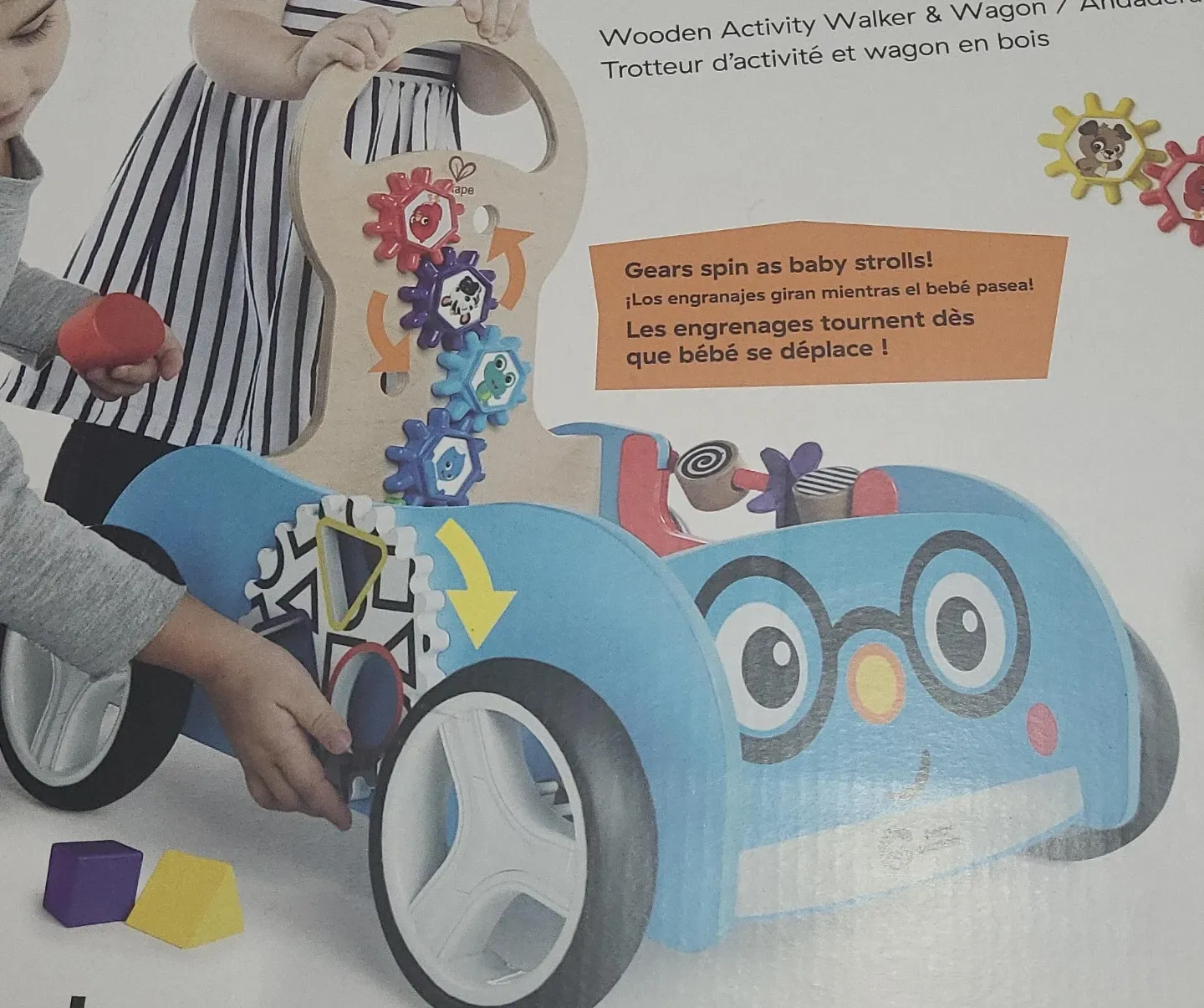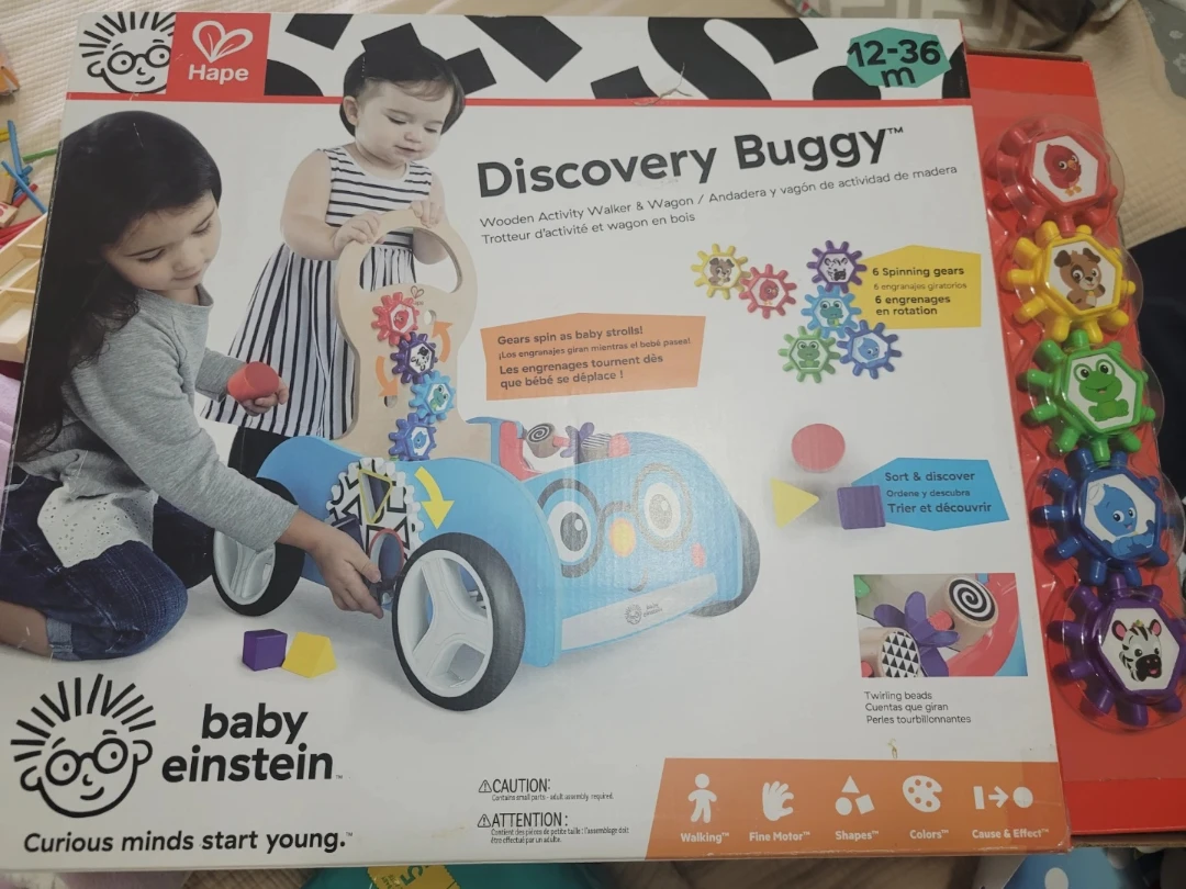 Selling a Hape Baby Einstein Discovery Buggy walker and wagon! It's a wooden activity walker designed for little ones aged 12-36 months. It includes 6 spinning gears for added fun. The buggy also helps with sorting and discovering!