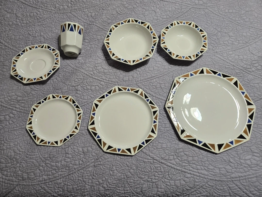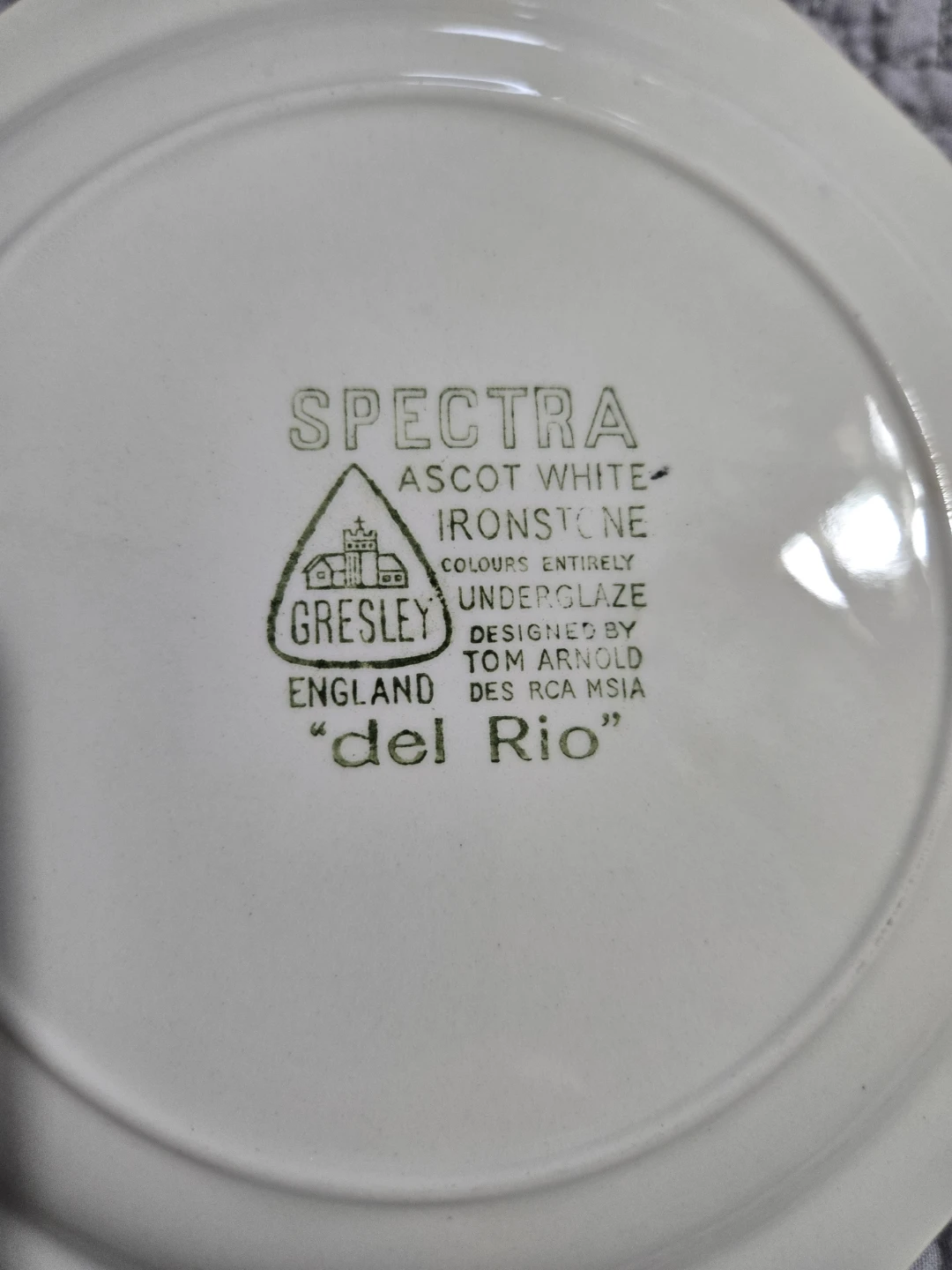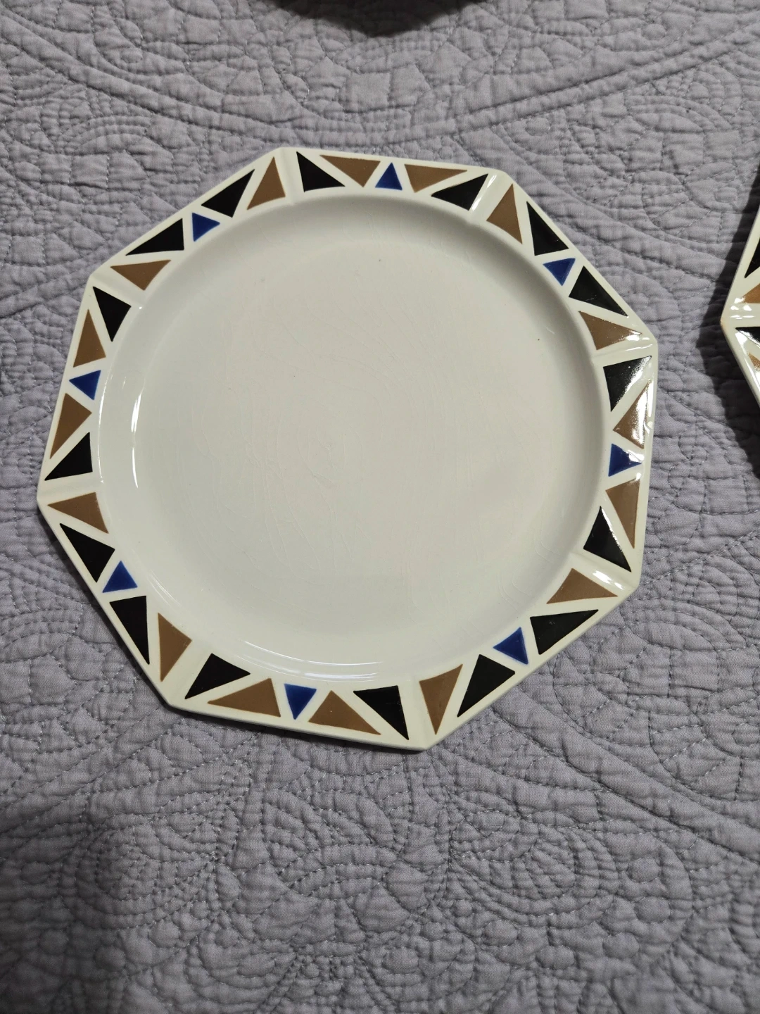 Selling a lovely set of Spectra Ascot White Ironstone plates. These plates feature a unique design with colourful triangles around the edges. Perfect for adding a touch of elegance to your dining table!