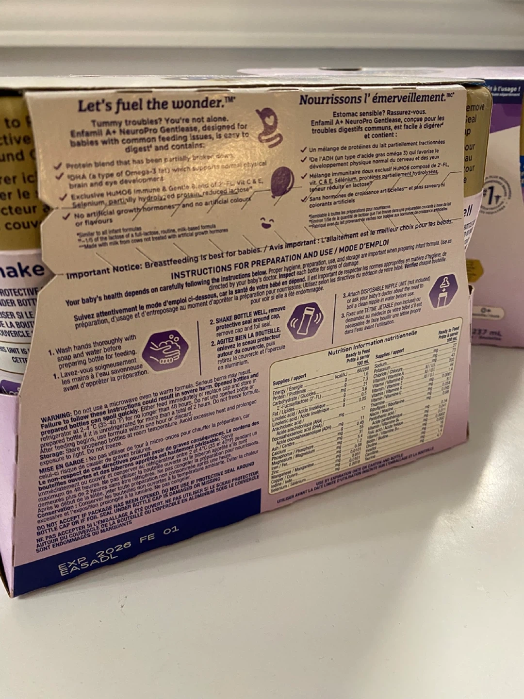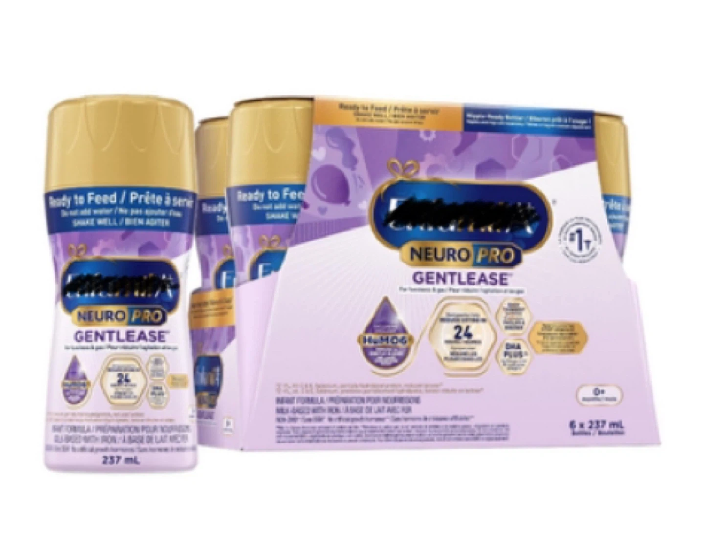 Selling a pack of Enfamil NeuroPro Gentlease Ready to Feed formula. Each pack contains 6 bottles, with each bottle holding 237mL. This formula is designed for babies with common feeding issues and contains DHA for brain and eye development. Expiry Date: 2026 February 01.