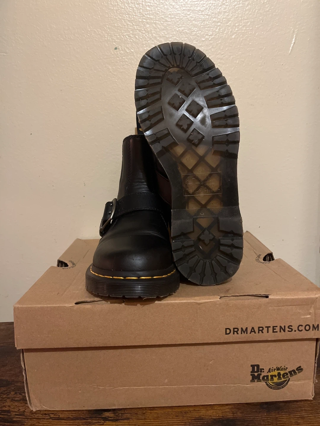 Selling a pair of Dr. Martens Chelsea boots in black leather. They're in great condition and come with the original box! The classic yellow stitching adds a nice touch.