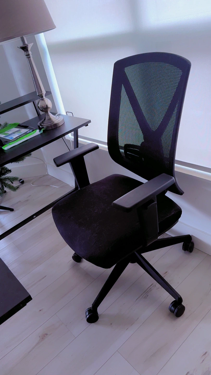 Selling a comfortable black office chair! It features a breathable mesh back and adjustable armrests for great support during long work sessions. The chair is in good condition and ready to enhance your home office setup