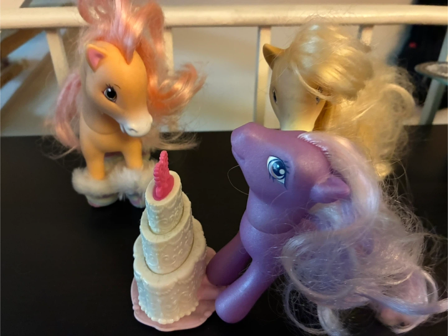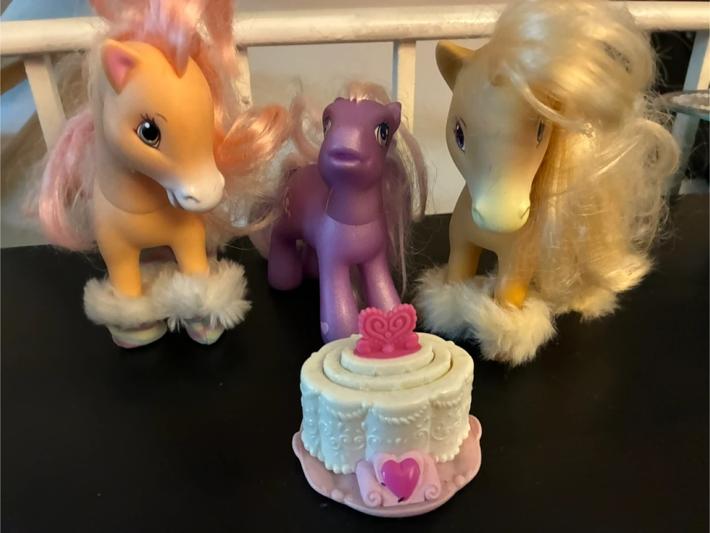 Selling a set of My Little Pony toys. They're in good condition for their age and would be a great addition to any collection. The cake has a magnetic pop-up when touched by the magnetic foot of the littlest of the little ponies.
