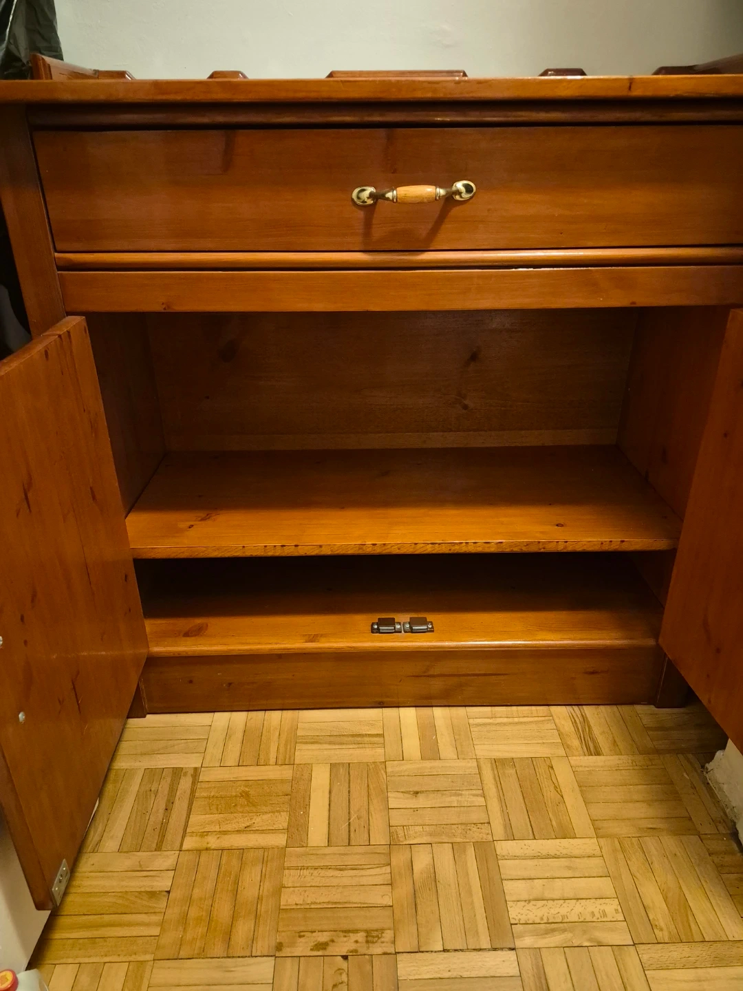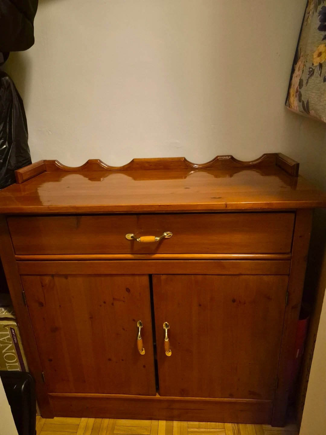 A lovely wooden cabinet with a drawer and two doors. It's perfect for adding some storage to your home. The cabinet is in good condition and ready to use!