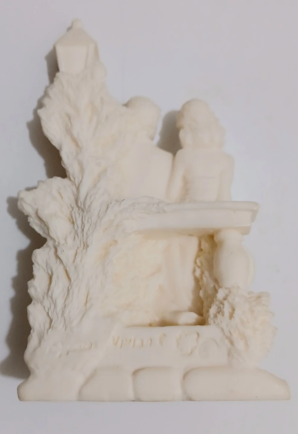 Elegant, Hand Crafted Alabaster, Signed Artist Vivian C figurine captures a romantic scene of a couple beneath a street lamp. It is in excellent condition, showcasing intricate details and a timeless design. It's a beautiful piece for collectors or as a decorative item.