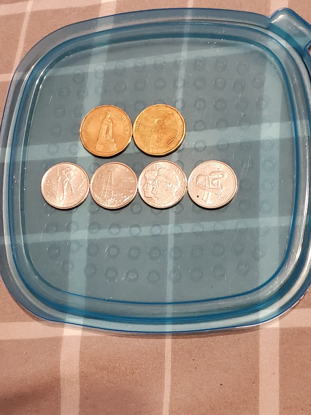A collection of toonies, loonies, quarters and a 50 cent piece.