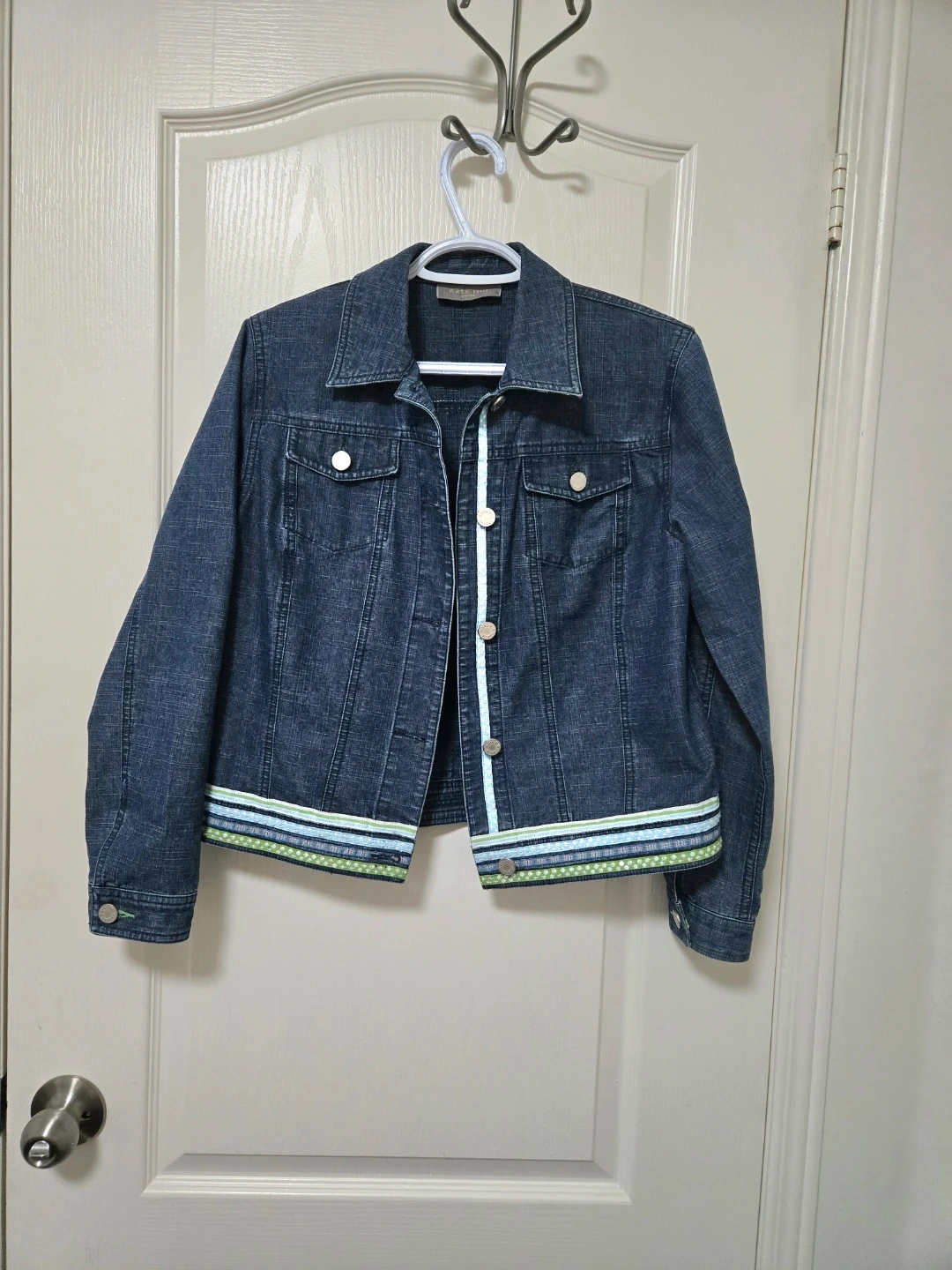 Here's a Kate Hill denim jacket in a size medium! It's a dark wash denim with some cute detailing on the bottom and along the front. Perfect for layering or wearing on its own