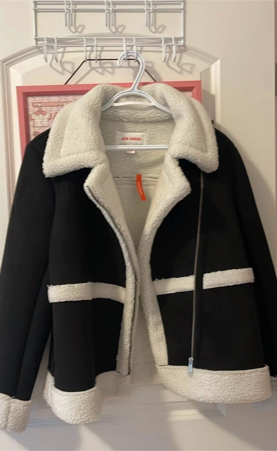 Cozy up in this stylish Joe Fresh jacket! It features a black faux suede exterior with a soft, white sherpa lining and trim. Perfect for adding a touch of warmth and style to your wardrobe.