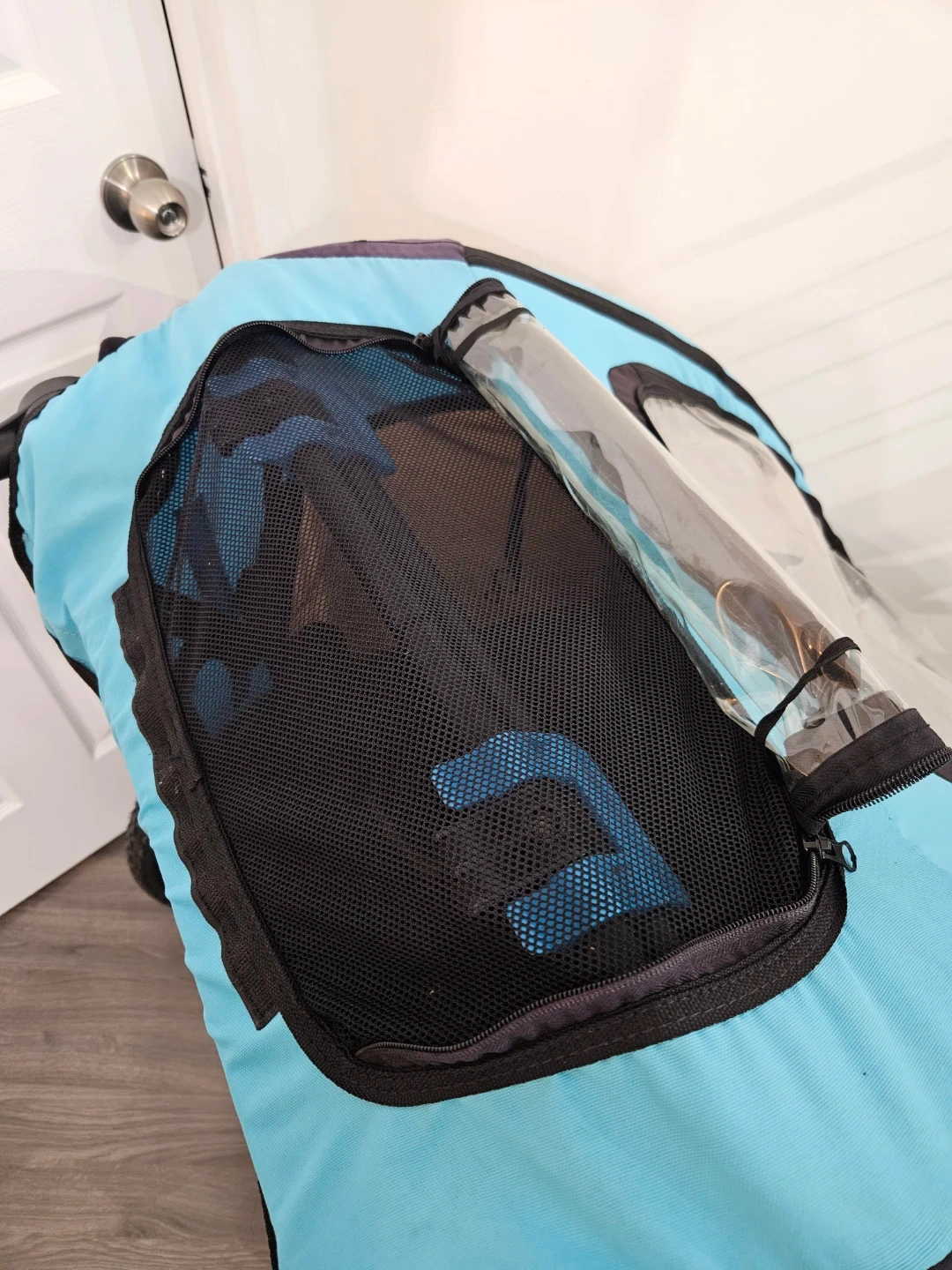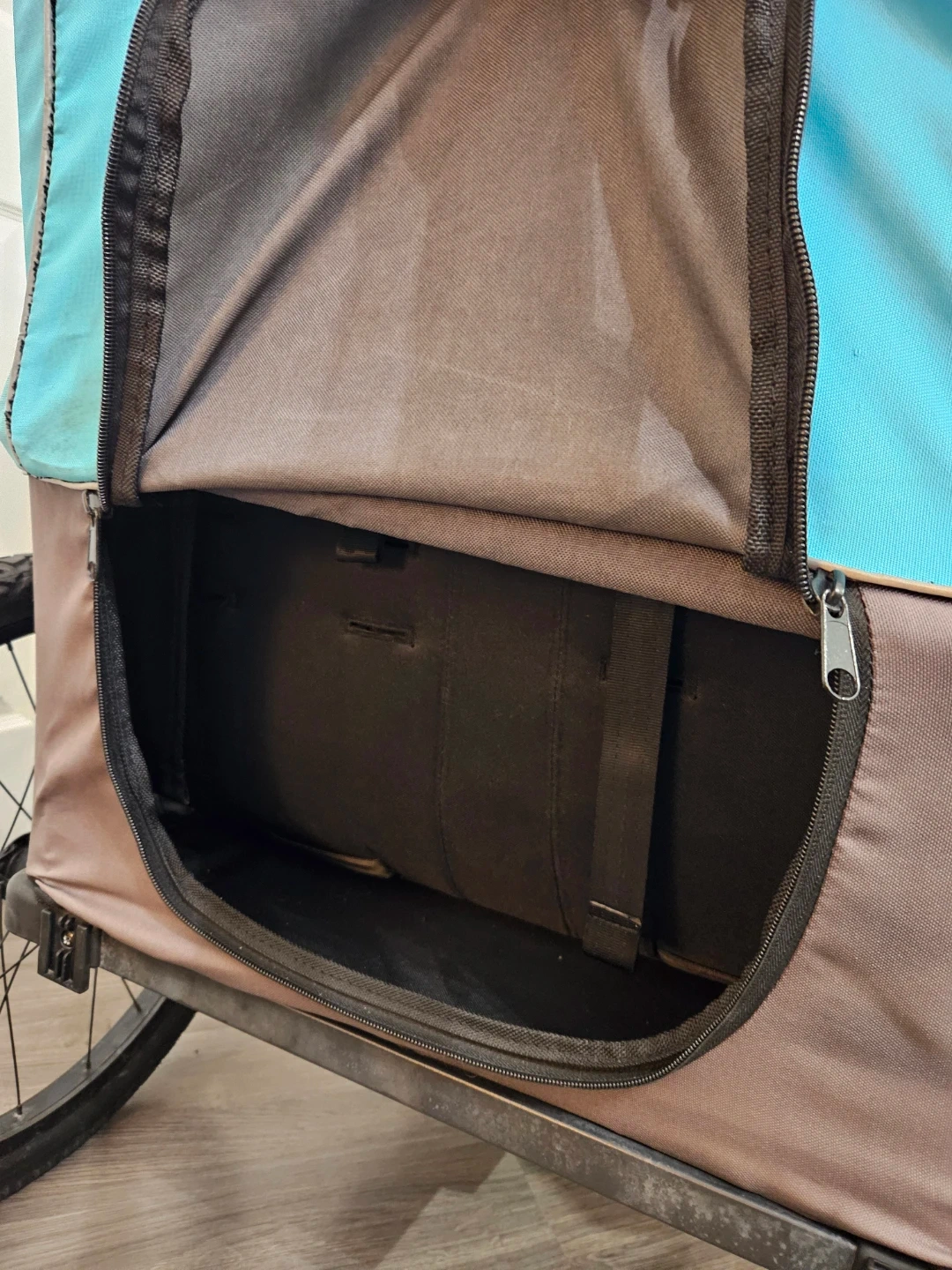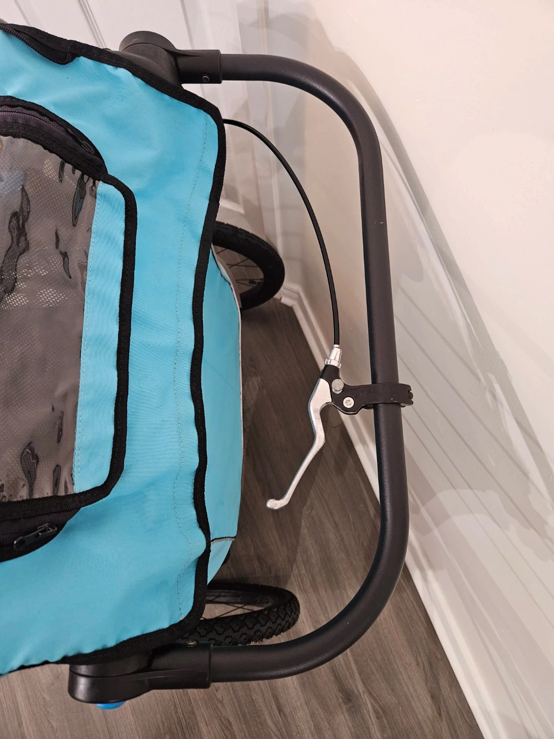 I primarily used it as a stroller. Front wheels are rubber, the back are large air tires (already pumped). Adjustable handle bar, hand brake/lock (works perfectly), storage available at the bottom.
