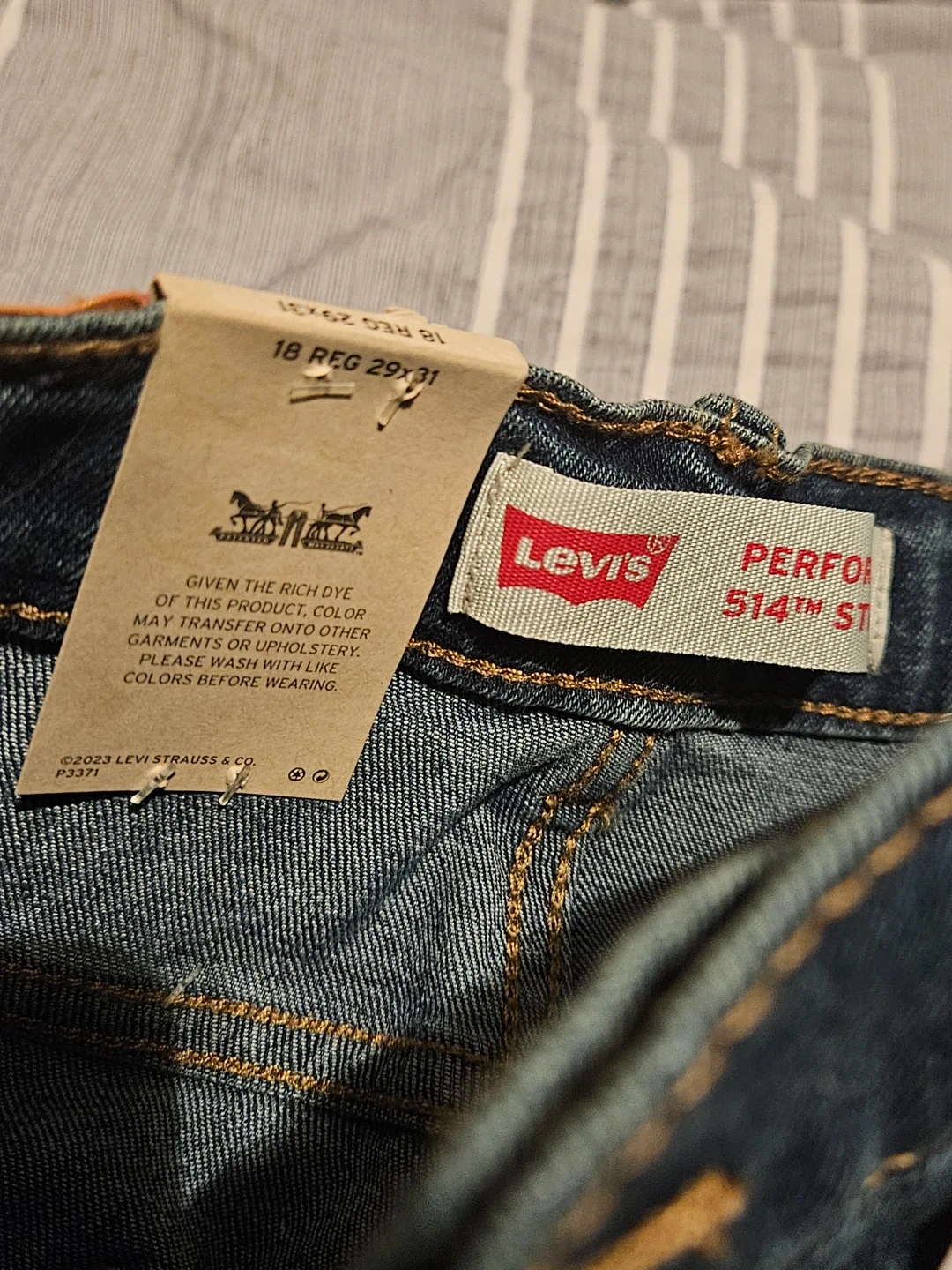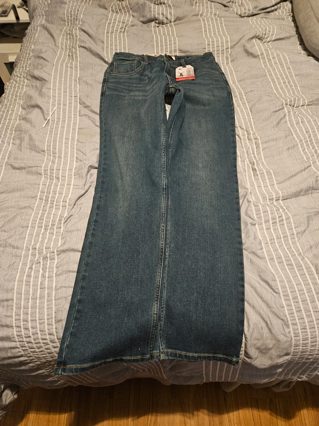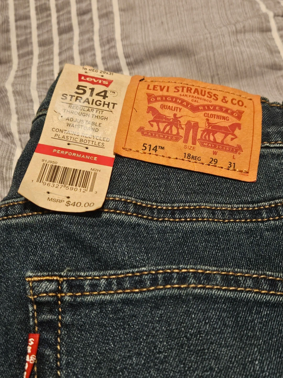 Levi's 514 Straight jeans in size 18 Regular, 29x31! These jeans are a regular fit through the thigh and have an adjustable waistband. They also contain recycled plastic bottles. The original price was $40